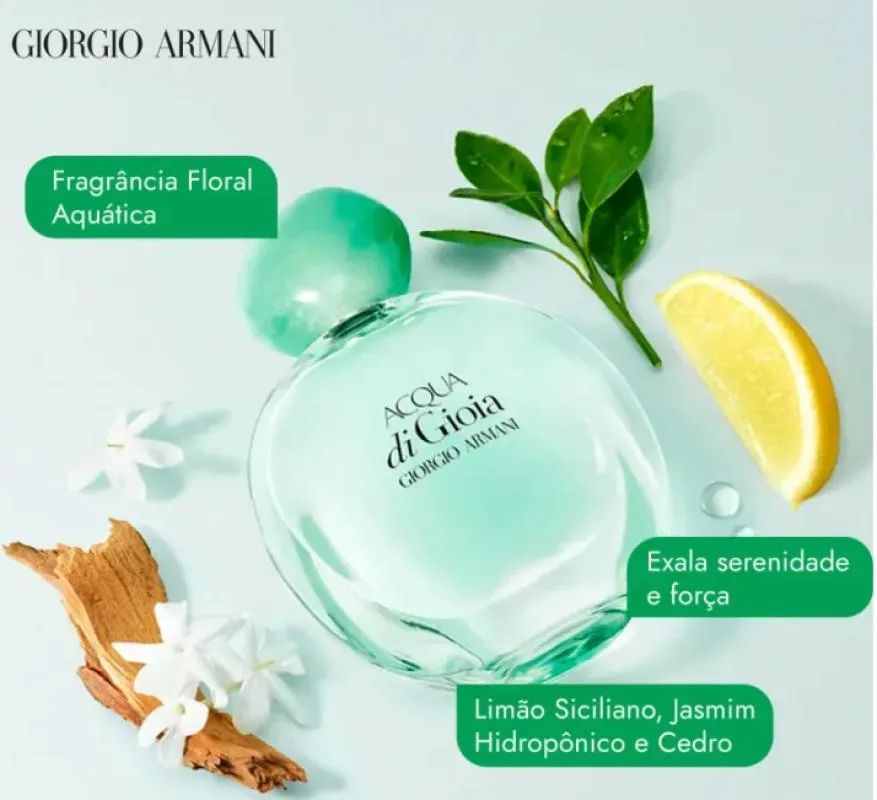 Acqua di Gioia é um hino à natureza em todas as suas formas. É um ambiente limpo, incrivelmente doce, um aquático ultra-acessível, mas memorável. A inspiração no mar forma o primeiro plano desta fragrância, elaborada para a mulher forte, digna e livre de espírito, em perfeita harmonia com a natureza. Este perfume de Giorgio Armani foi levado pela ideia de fugir para um local paradisíaco onde podemos restaurar a energia necessária para o corpo e a alma, e onde vivenciamos um equilíbrio natural.