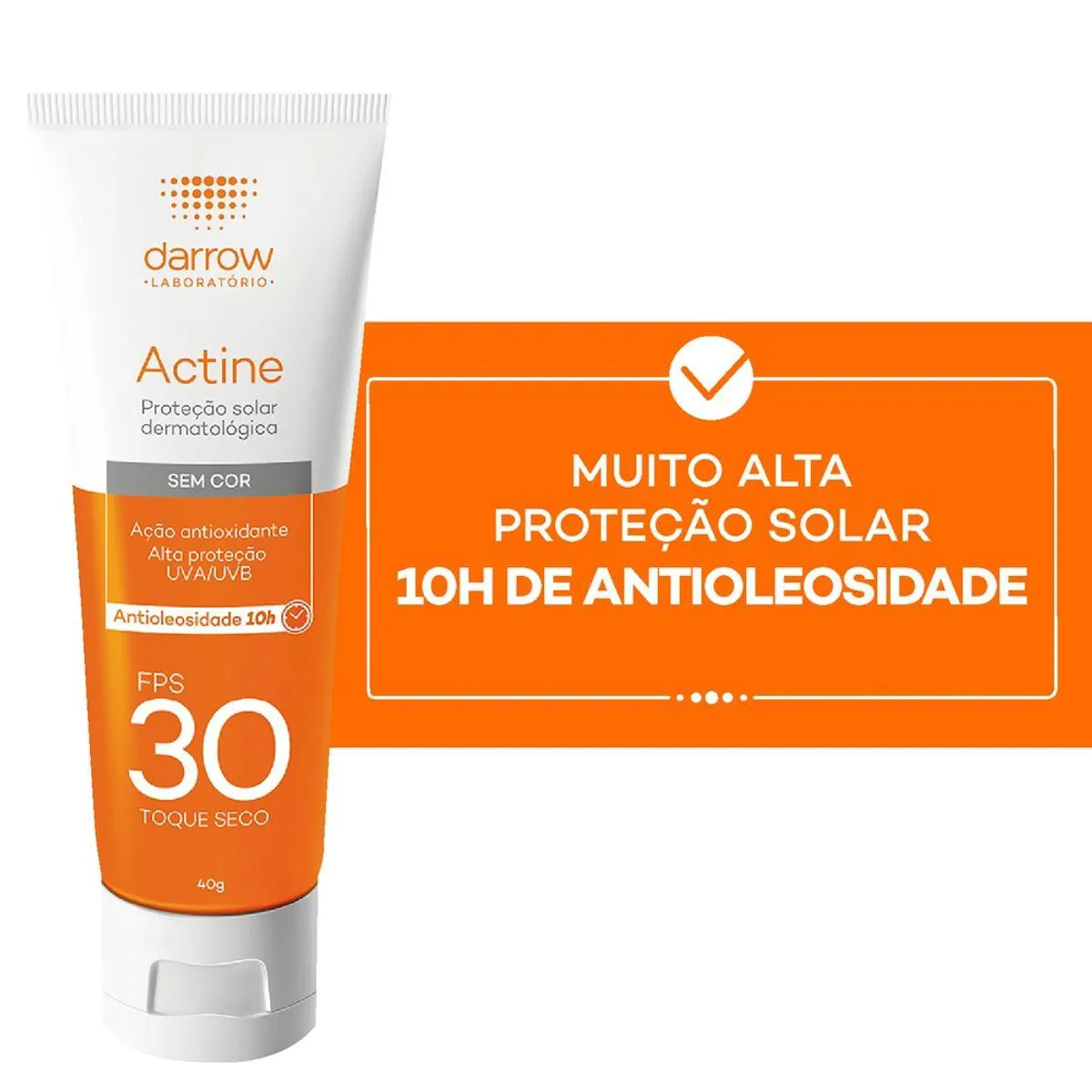 Indicado para peles oleosas e acneicas, o Protetor Solar Actine FPS 30 possui textura fluida e não oleosa, que, quando absorvida pela pele, oferece alta proteção solar contra os raios UV e 10 horas de antioleosidade, além de promover ação antioxidante, que previne o envelhecimento precoce da pele.