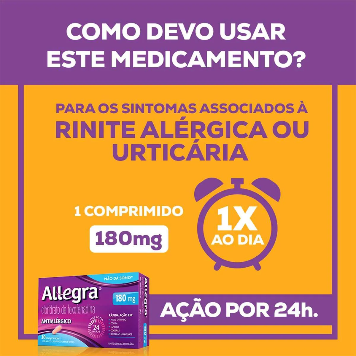 Recomenda-se que o medicamento seja tomado com água por via oral. Para os sintomas associados à rinite alérgica: 01 comprimido de 60 mg duas vezes ao dia (de 12 em 12 horas), 01 comprimido de 120 mg uma vez ao dia ou 01 comprimido de 180 mg uma vez ao dia. Para os sintomas associados à urticária: 01 comprimido de 60 mg duas vezes ao dia (de 12 em 12 horas) ou 01 comprimido de 180 mg, uma vez ao dia. Não há estudos dos efeitos de Allegra administrado por vias não recomendadas. Portanto, por segurança e para eficácia deste medicamento, a administração deve ser somente pela via oral.