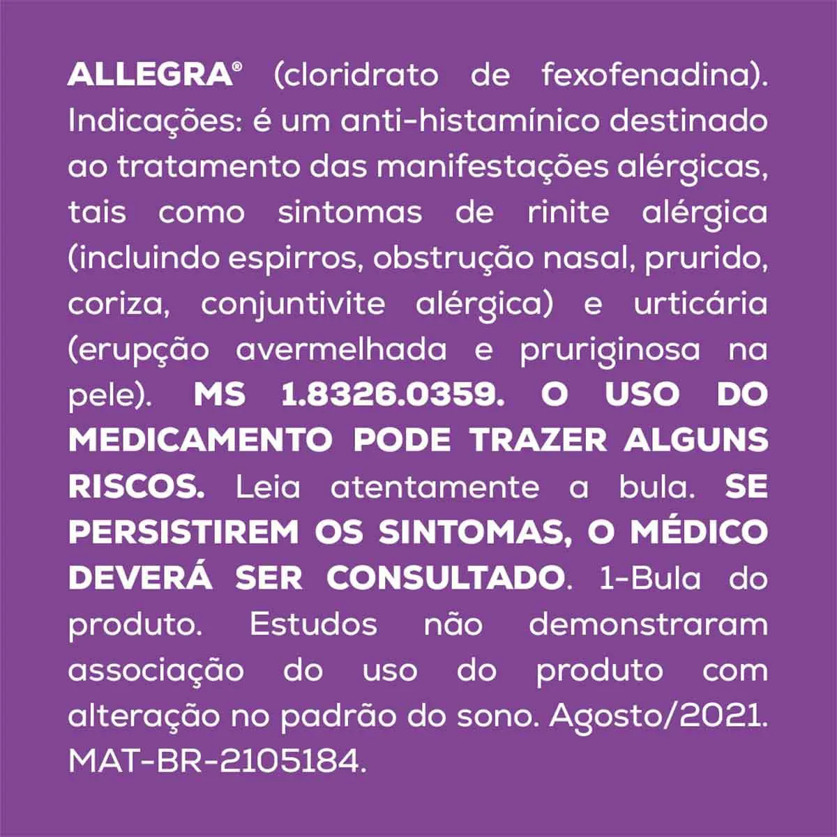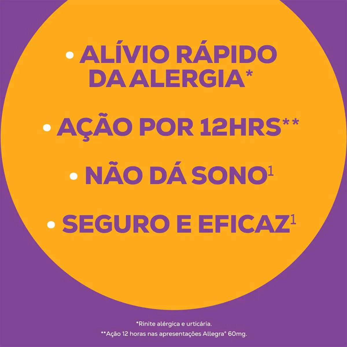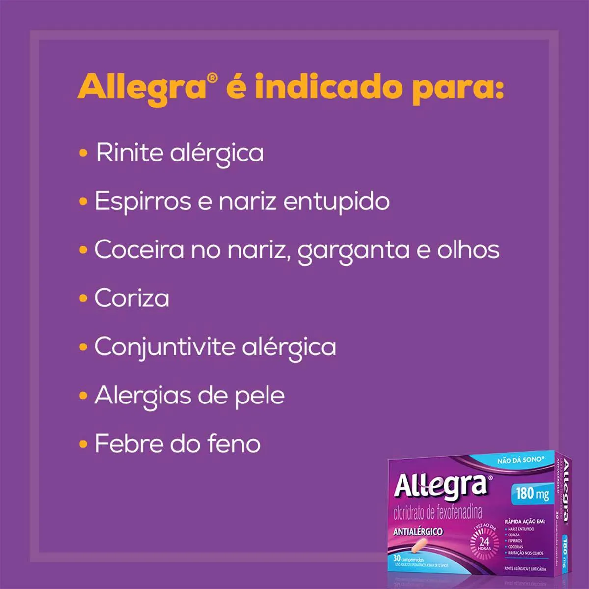 Allegra é o antialérgico nº1 do mercado trazendo alívio rápido da alergia e não dá sono, indicado para os sintomas da Rinite Alérgica e urticária, tem rápida ação para nariz entupido, coriza, espirro e coceiras nos olhos, nariz, garganta e pele - com eficácia e segurança.