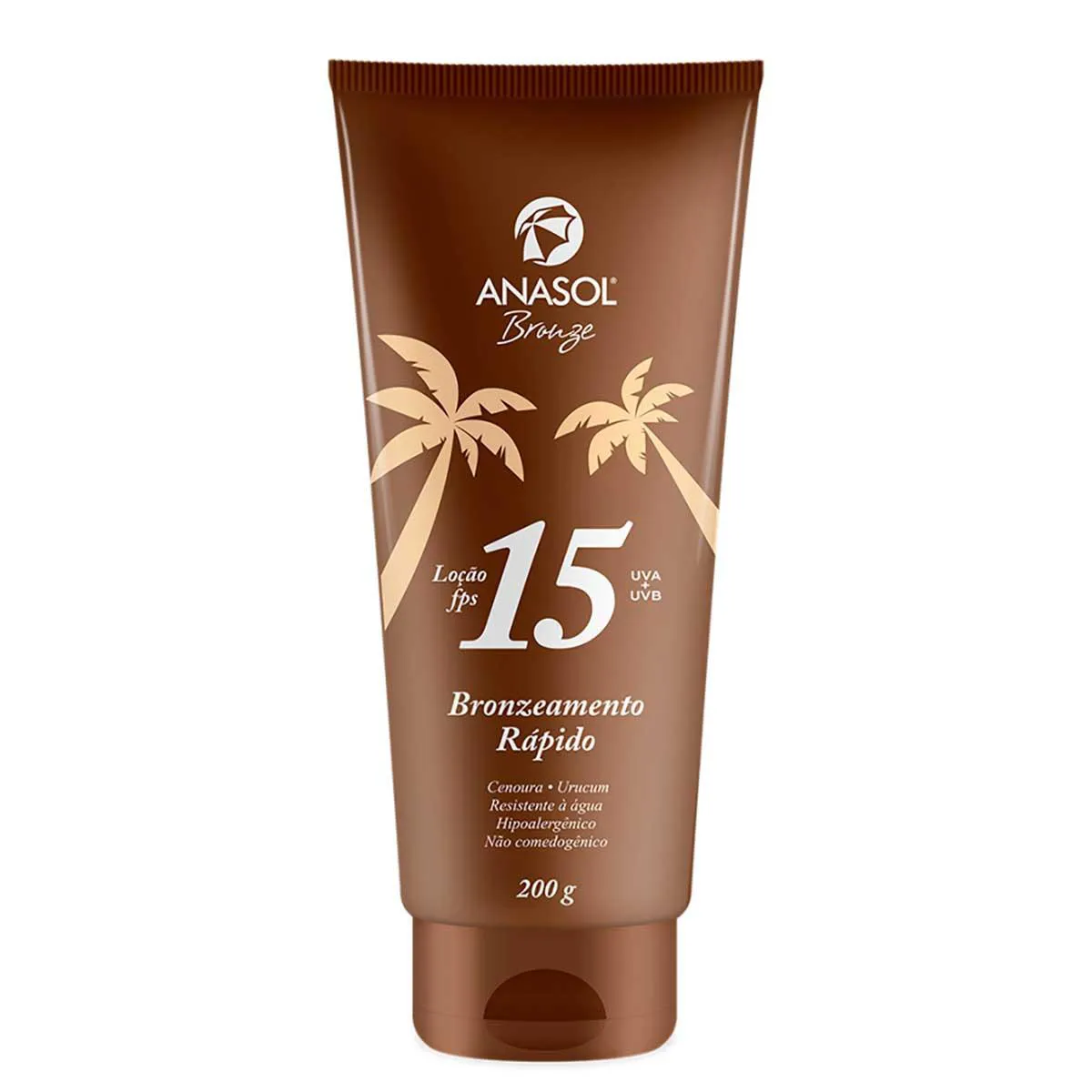 Anasol Bronze é uma loção bronzeadora que oferece alta proteção contra os raios UVB e UVA (FPS 15). Com toque seco, sua fórmula é enriquecida com extratos naturais de Cenoura e Urucum, deixando a Pele bronzeada e hidratada.
