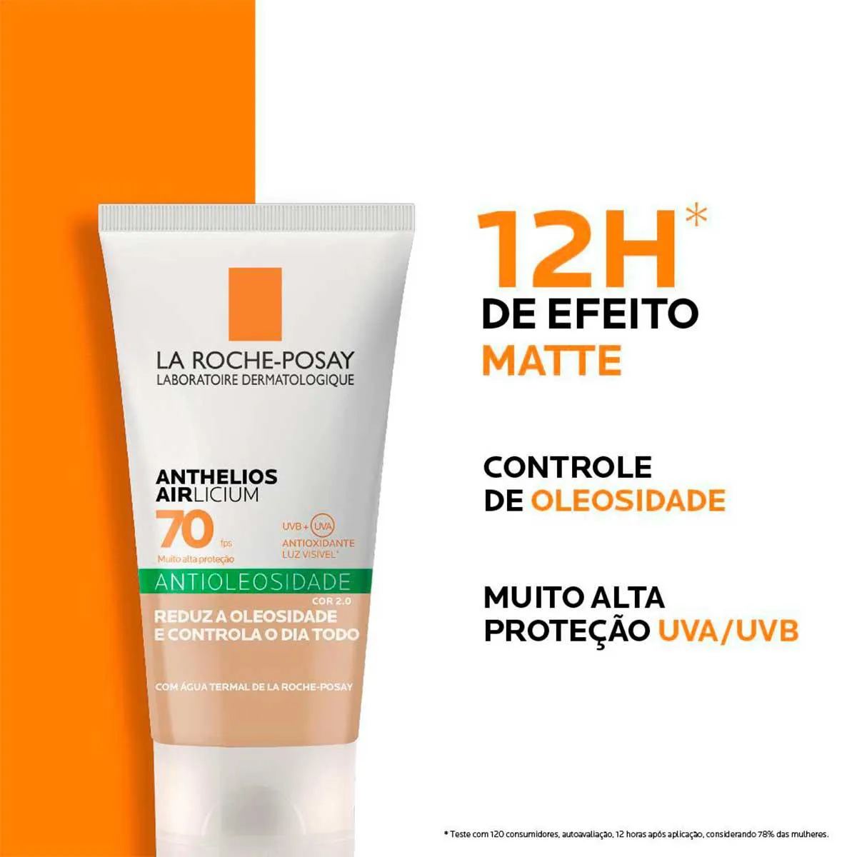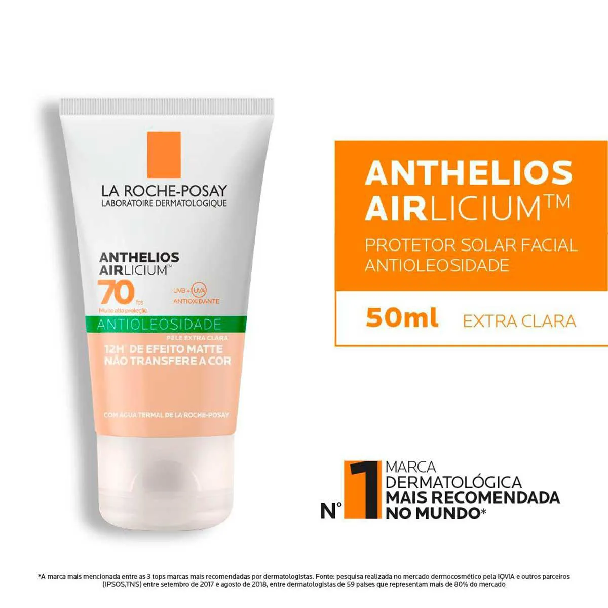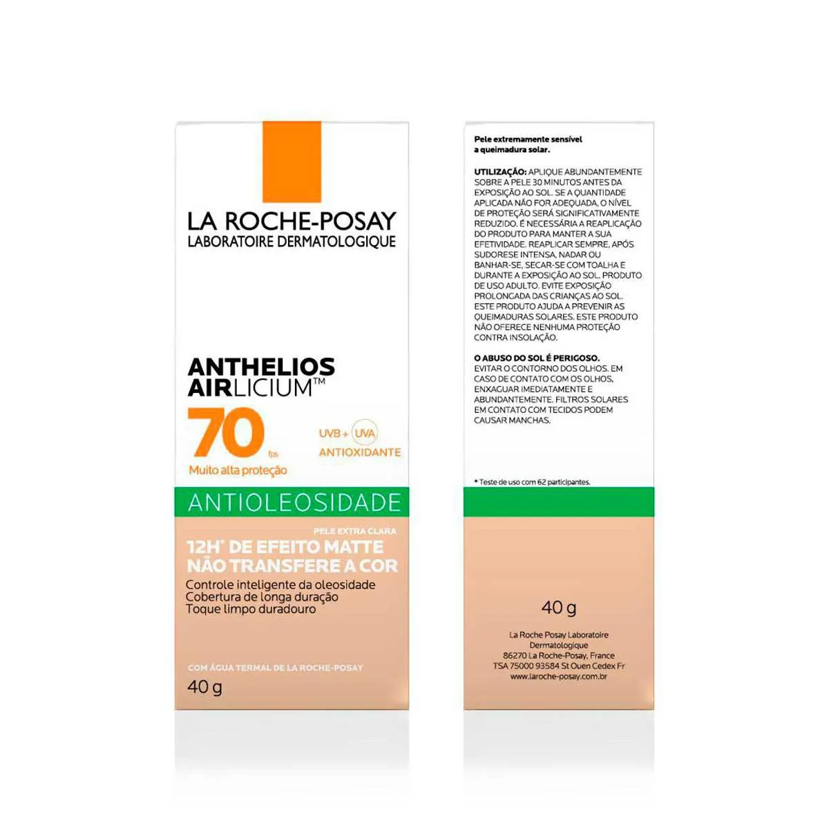 Anthelios Airlicium FPS 70 é um protetor solar com cor que contém moléculas Airlicium, que controlam a oleosidade sem pesar ou derreter. Elaborado com água termal de La Roche-Posay, ele garante cuidado diário com fórmula completa e ação antioleosidade.