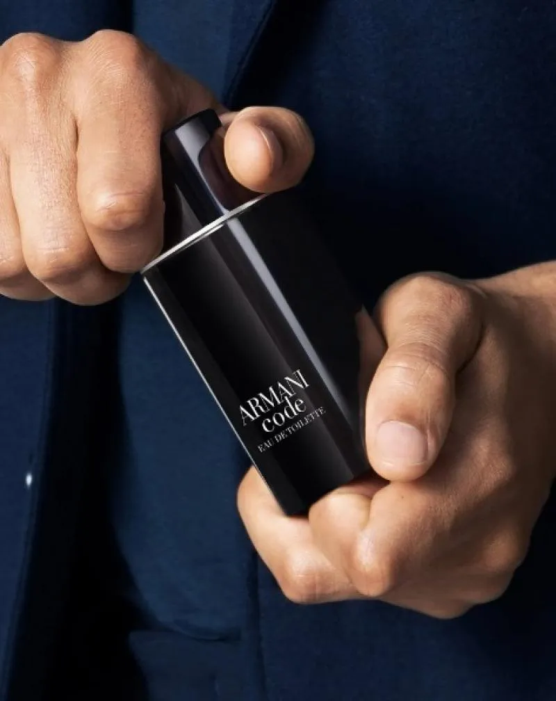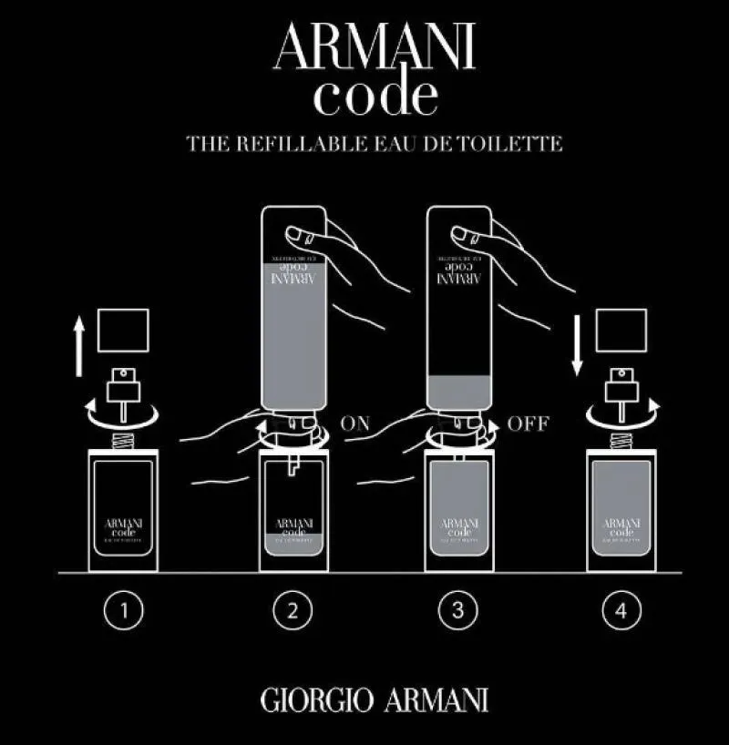 O perfume Armani New Code, de Giorgio Armani, combina um cocktail de cidra de aroma de bergamota e limão com notas macias de flor de oliveira, aquecido com Guaiac e Tonka Bean, para criar uma mistura aromática amadeirada que é duradoura e única. Todos os tamanhos são recarregáveis em um novo e moderno design de frasco. Refilar sua fragrância economiza 38% de vidro, 67% de metal e 20% de plástico.