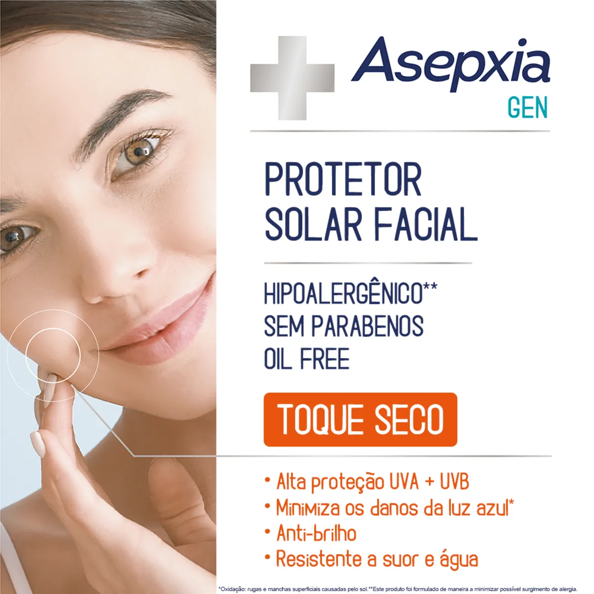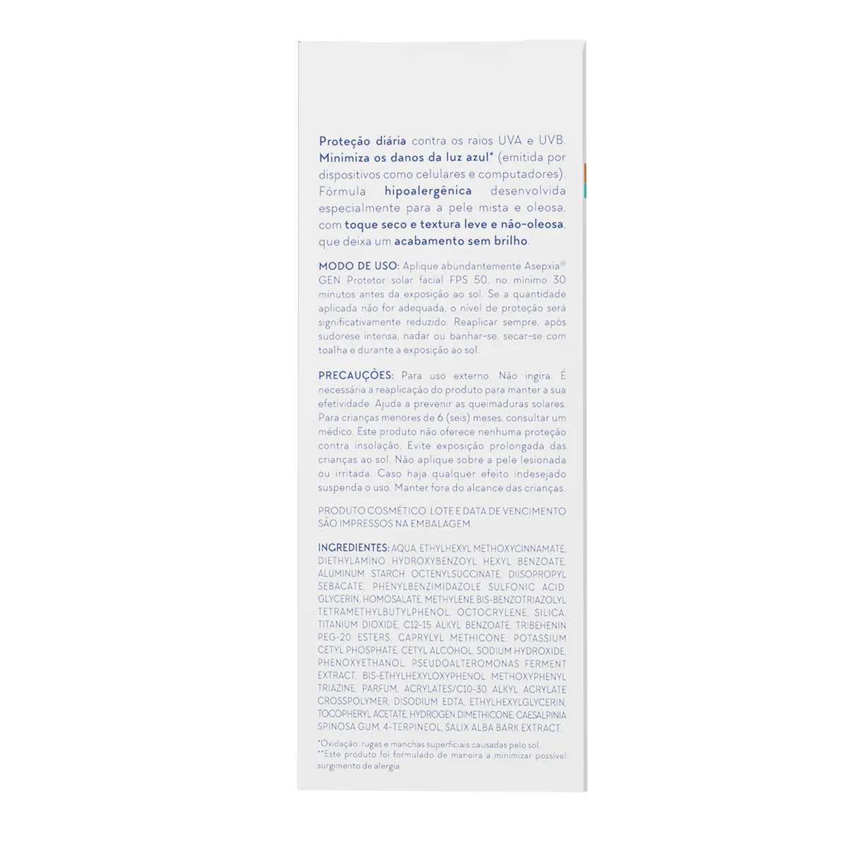 Indicado para Pele mista e oleosa, o protetor solar facial Asepxia Gen FPS 50 protege contra os raios UVA e UVB, além de combater os danos causados pela luz azul (emitidas por celulares e computadores). Resistente ao suor e à água, ele oferece toque seco e textura leve, deixando um acabamento sem brilho na pele.