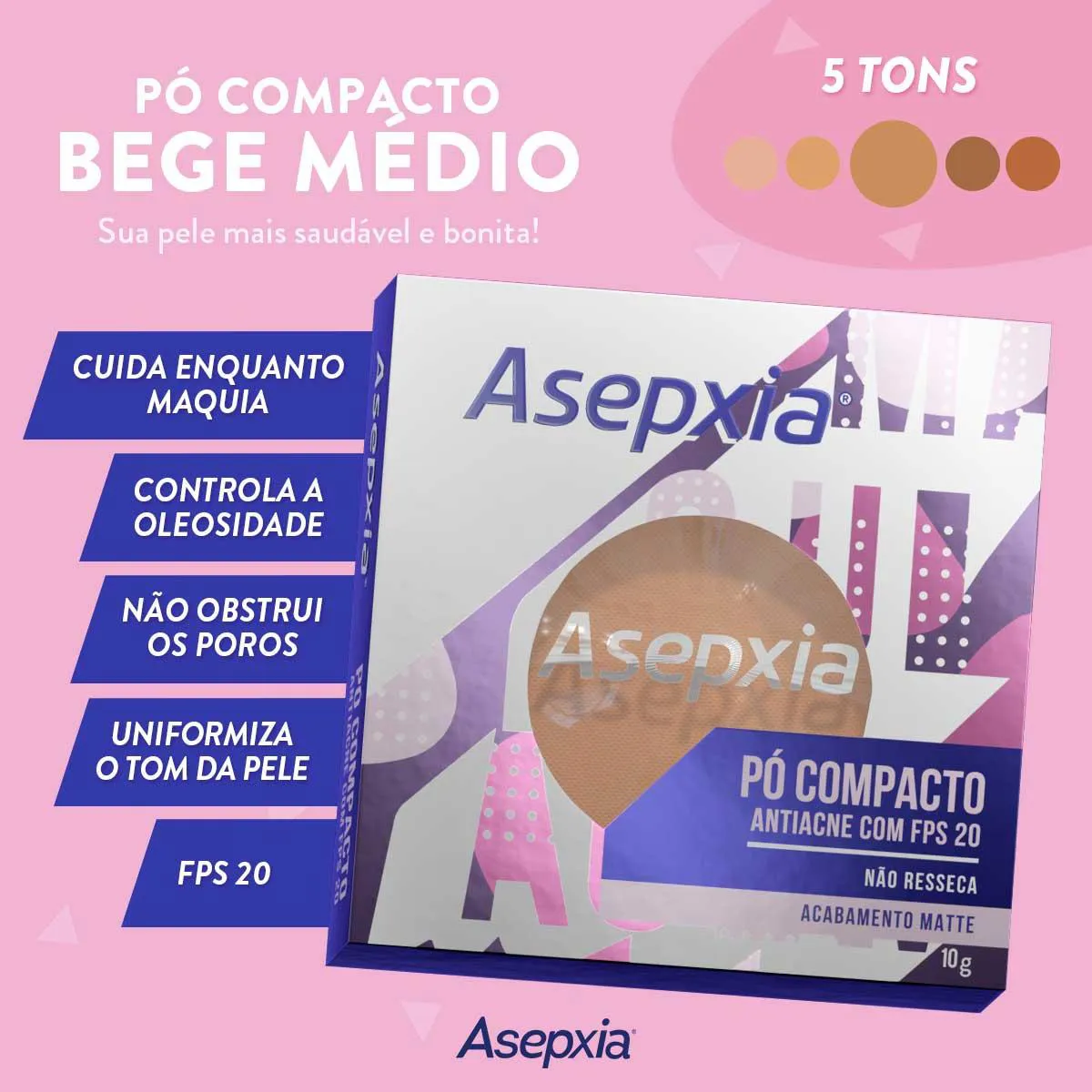 O Pó Compacto Asepxia Antiacne FPS 20 foi desenvolvido especialmente para a Pele mista, oleosa ou acneica, e é ideal para você incluir na sua kit de maquiagem. Além dele uniformizar o tom da pele e disfarçar marcas visíveis, ele também ajuda a prevenir cravos e espinhas e a reduzir o tamanho dos poros.