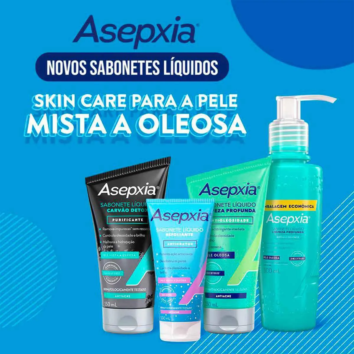 O Sabonete Líquido Asepxia Carvão Detox Purificante une o poder do carvão ativado com a expertise da Asepxia para cuidar da Pele mista e oleosa.