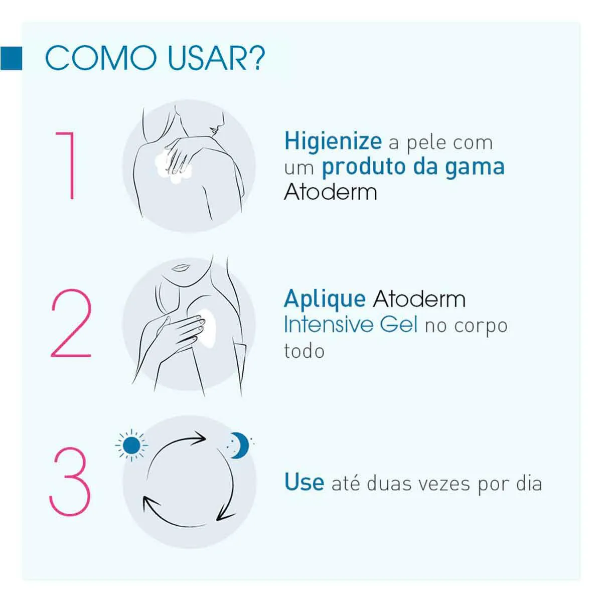 Após a Limpeza da Pele com o produto de sua preferência, aplique o Atoderm Intensive sobre a pele e massageie delicadamente até a completa absorção do produto.