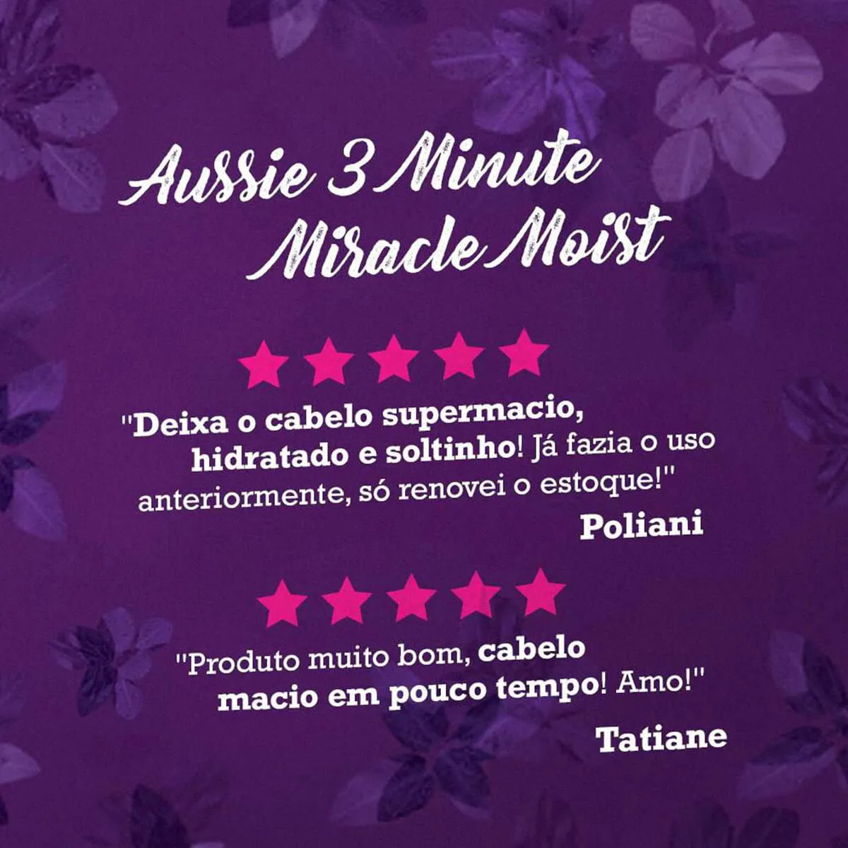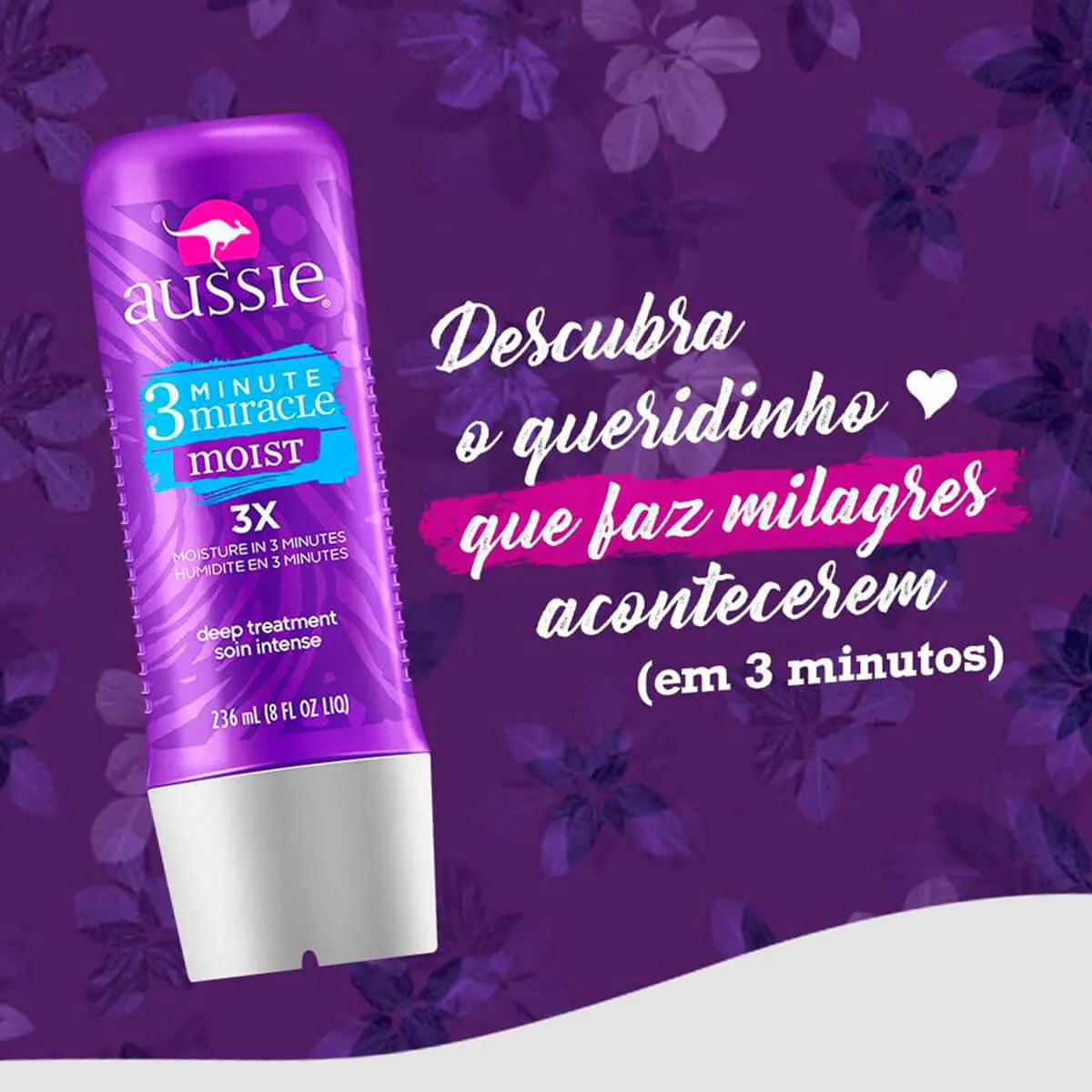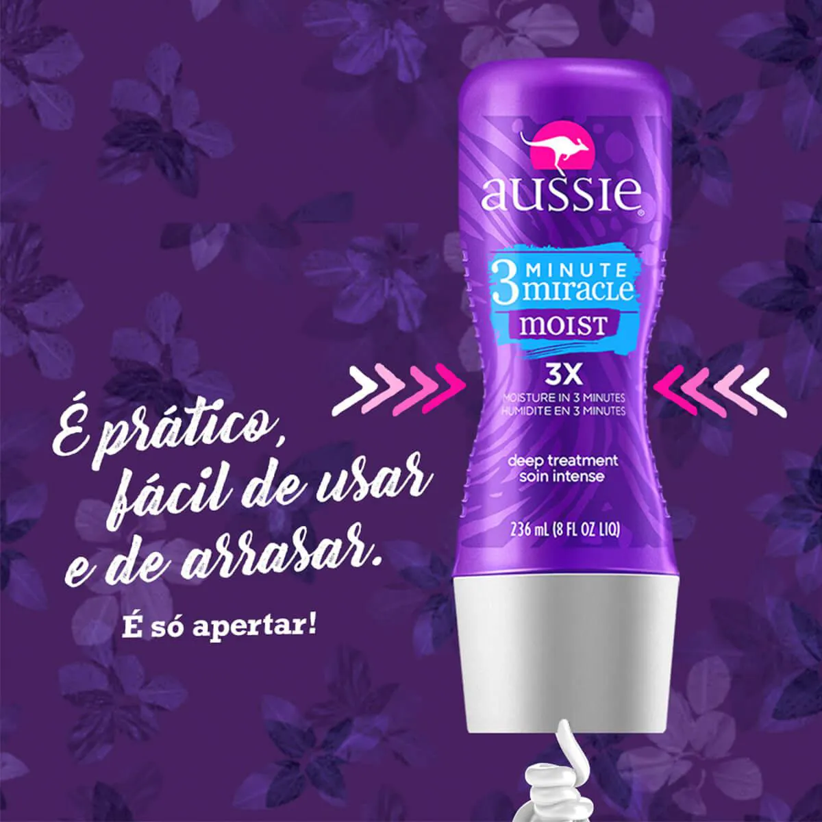 Aussie Moist 3 Minutos Milagrosos é um creme de tratamento capilar que deve ser aplicado nos cabelos após o uso do shampoo e condicionador. Depois de agir por 3 minutos, ele hidrata profundamente, nutre e dá brilho, deixando os cabelos macios, suaves e perfumados.