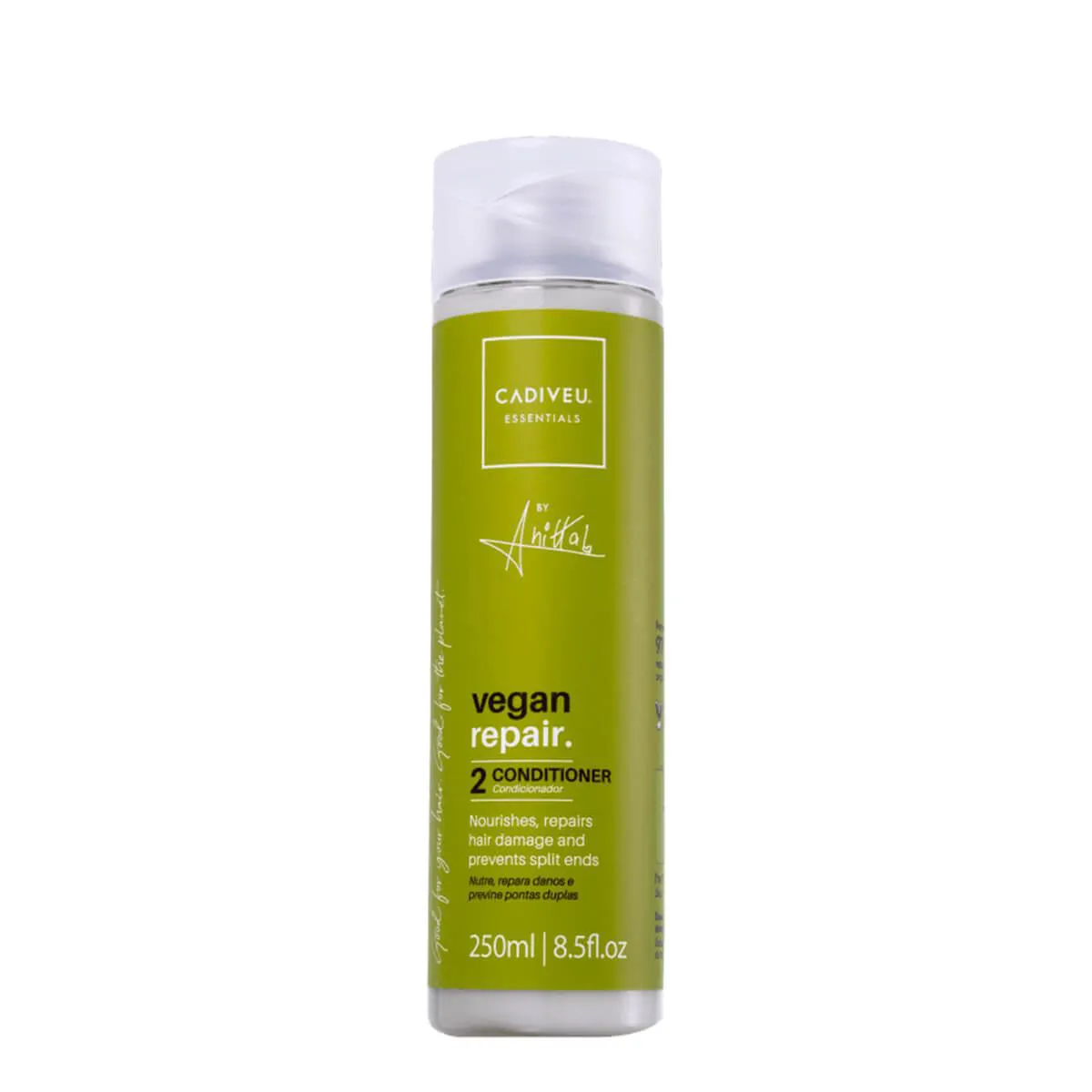 Condicionador para cabelos danificados Cadiveu Professional Essentials Vegan Repair by Anitta previne a quebra, fecha as cutículas dos fios e controla o frizz, além de facilitar o desembaraço.