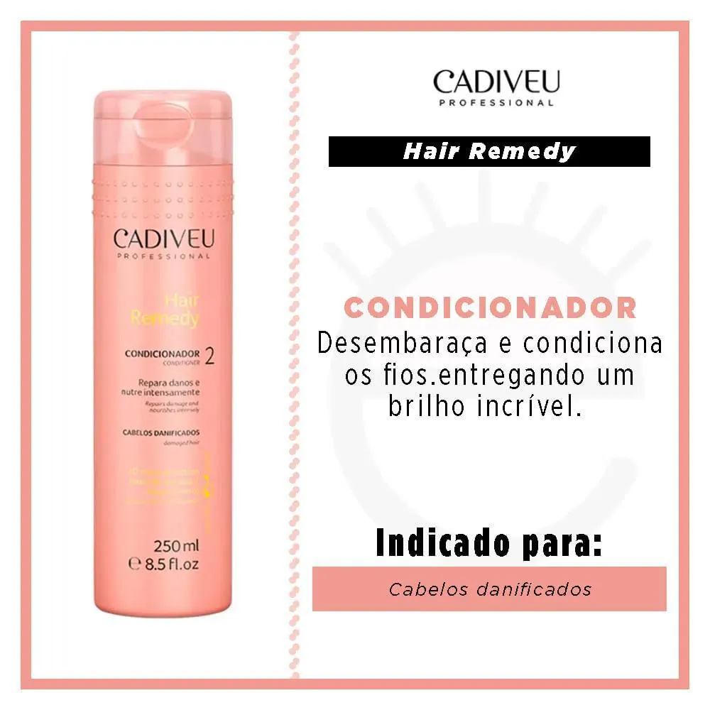 * Descrição Técnica: o Cadiveu Professional Hair Remedy Condicionador, Graças à Sua Tecnologia Exclusiva, Resgata o Aspecto Saudável, Além de Facilitar o Desembaraço e Condicionamento Dos Fios, Criando Uma Barreira Protetora Contra Futuros Danos. * Modo de Uso: sobre o cabelo Limpo e Úmido, Aplique No Comprimento e Pontas, Evitando o Couro Cabeludo, Massagei Suavemente Os Fios, No Sentido do Fechamento Das Cutículas. Enxágue Completamente o Produto. * Resultado: cabelo Condicionado com Leveza, Desembaraçado, Reparado e sem Frizz.