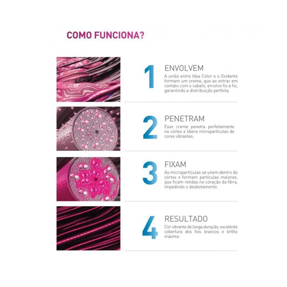 A Cadiveu Professional Idea Color É Uma Coloração com Cores Vibrantes, Máxima Cobertura Dos Fios Brancos e Luminosidade Máxima. As Colorações Vestem a Fibra Capilar com Nuances Autênticas, com Uma Fragrância Suave Ela Tem Baixa Concentração de Amônia e Um Alto Poder de Tratamento da Fibra Capilar. * SUGESTÕES DE USO: