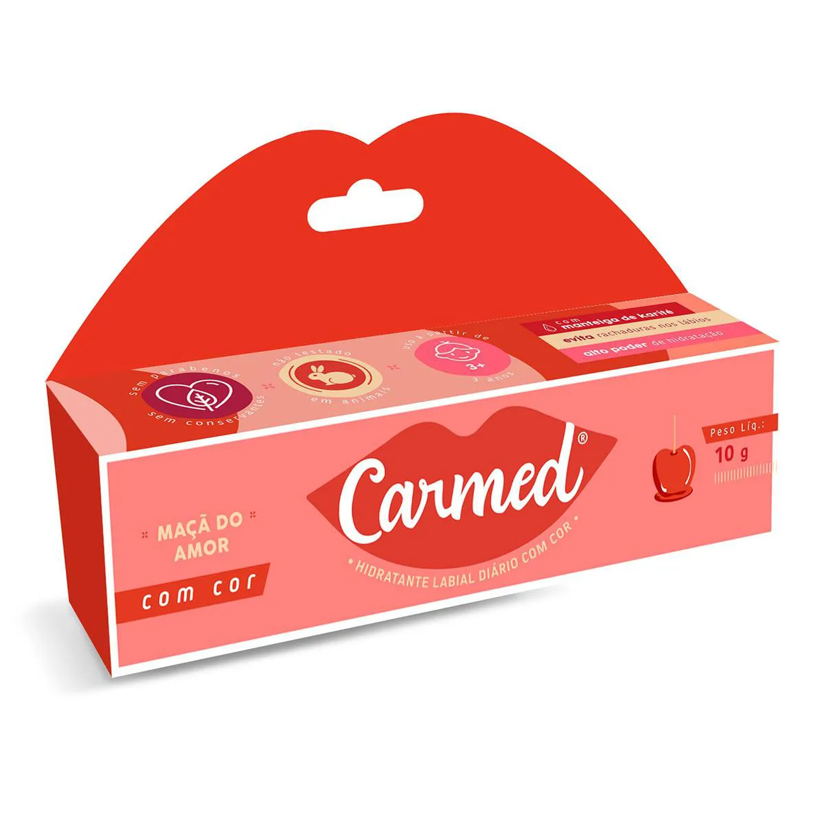 Carmed Maçã do Amor é um hidratante labial com cor vermelha, efeito gloss e delicioso aroma de Maçã do Amor.