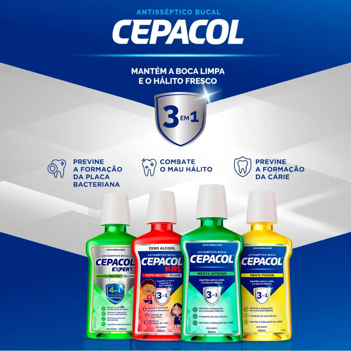 O enxaguante bucal Cepacol Menta é indicado como um complemento da higiene bucal, com recomendação de uso logo após a Escovação dos dentes, o uso do fio dental e/ou do raspador de língua.