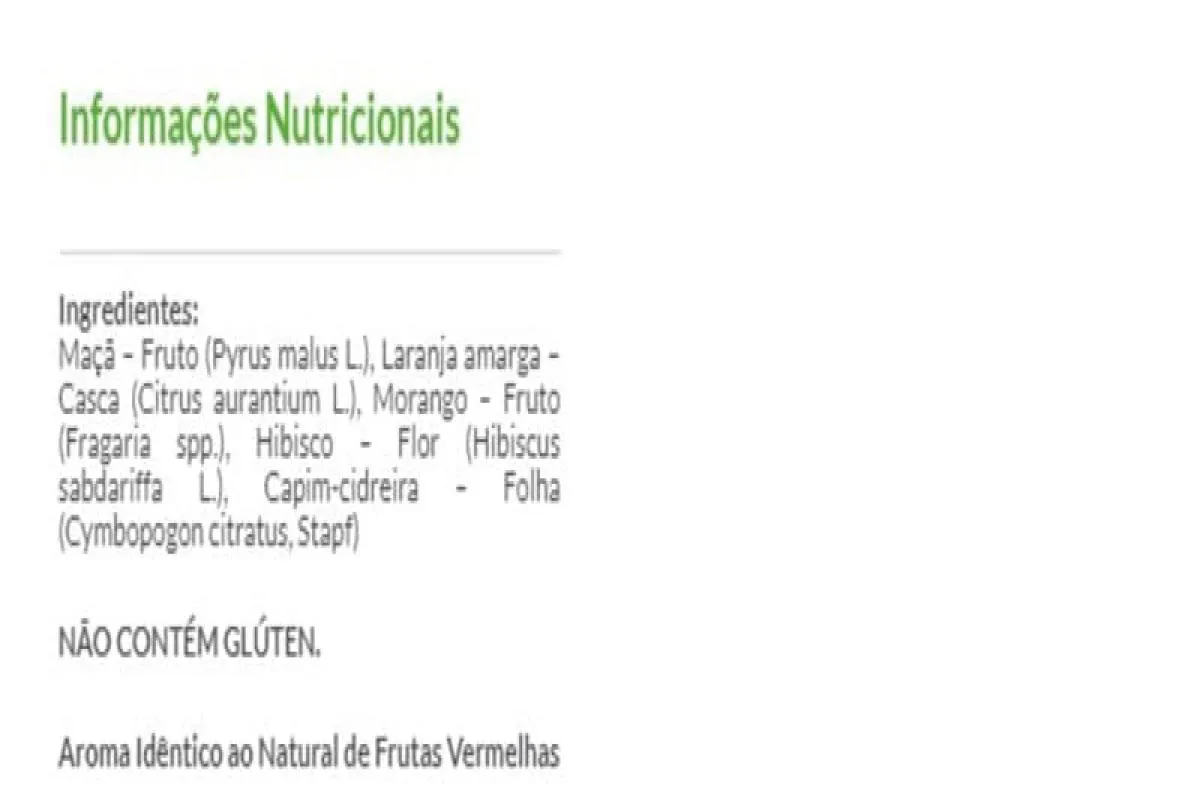 O Chá Misto Sublime Paixão, da Chá Mais é formulado com ingredientes naturais: a Maçã (Pyrus malus L.), a casca da Laranja amarga (Citrus aurantium L.), o Morango (Fragaria spp.), o Hibisco (Hibiscus sabdariffa L.) e folha de Capim-cidreira (Cymbopogon citratus, Stapf).