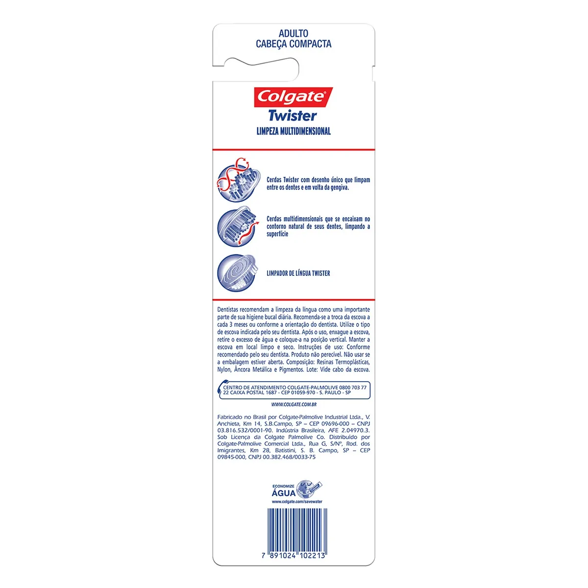 O que é: Escova dental Colgate Twister para uma limpeza multidimensional com cerdas twister que limpam entre os dentes e em volta da gengiva. Possui cabo antiderrapante e cerdas em formato "V" que tem profundo alcance para uma melhor limpeza entre os dentes.