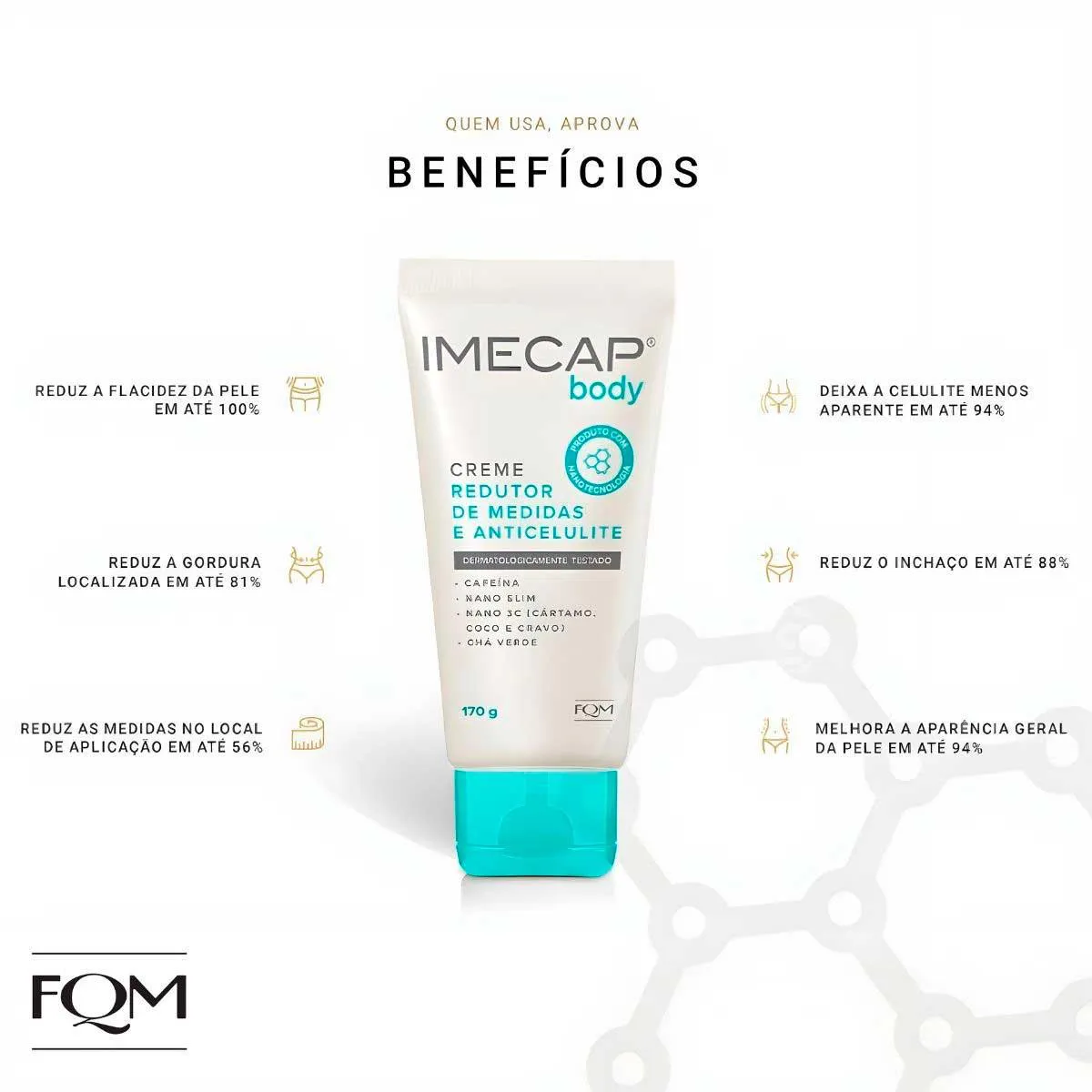 Imecap Redutor de Medidas é um creme corporal que ajuda a amenizar a aparência das celulites existentes e a reduzir medidas. Quando utilizado em conjunto com uma Alimentação balanceada e a prática de exercícios físicos, ajuda na redução da gordura localizada.