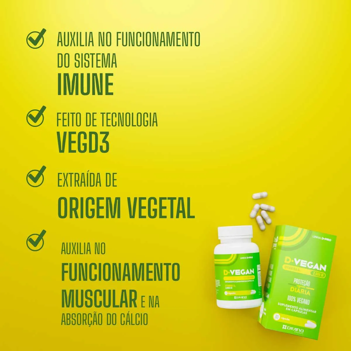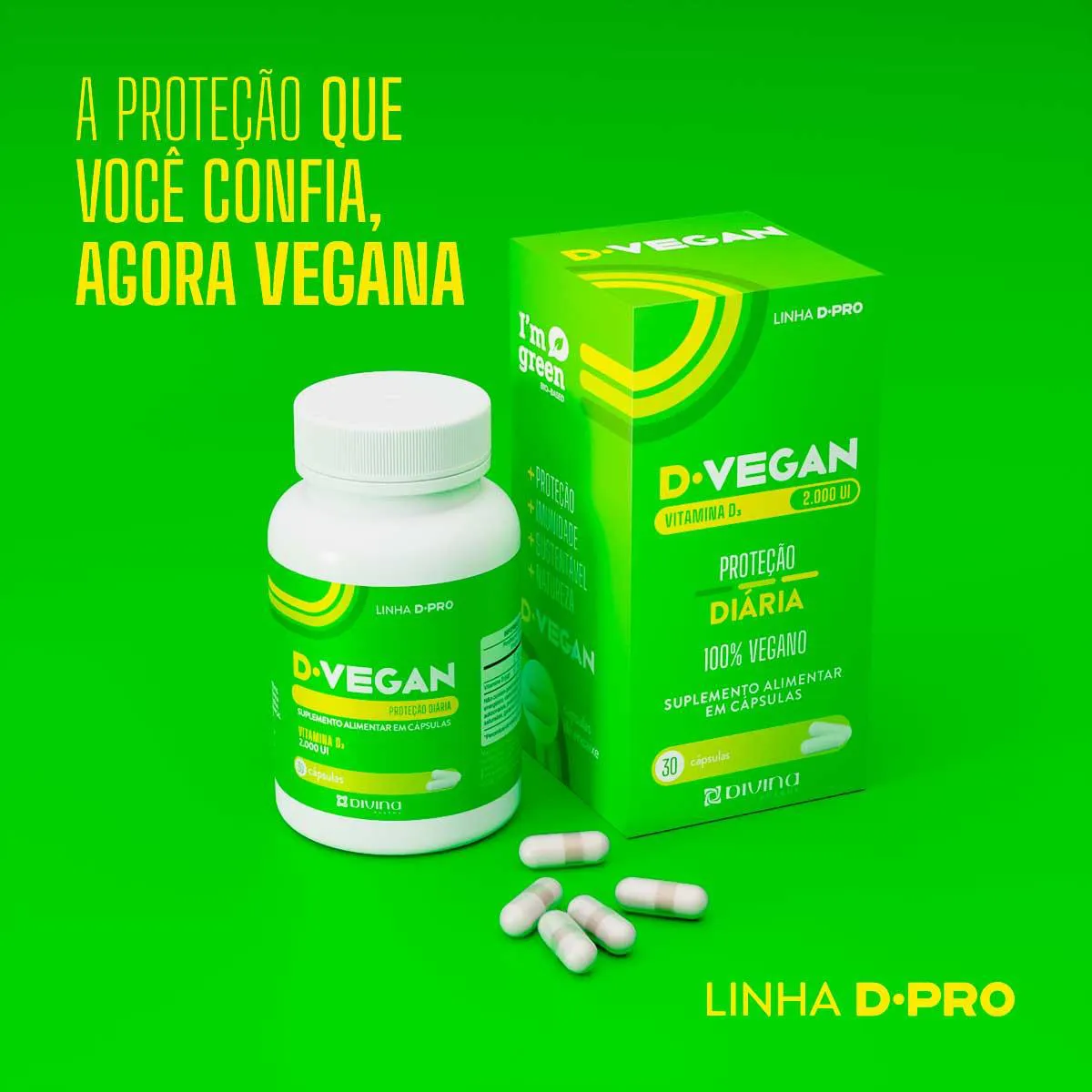 Um suplemento alimentar em cápsulas, D-Vegan é a Vitamina D vegana com 2000UI para a sua proteção diária. Feito a partir de tecnologia exclusiva VegD3, D-Vegan foi formulado para auxiliar no melhor funcionamento do sistema imune e auxiliar no funcionamento muscular e na absorção de cálcio.