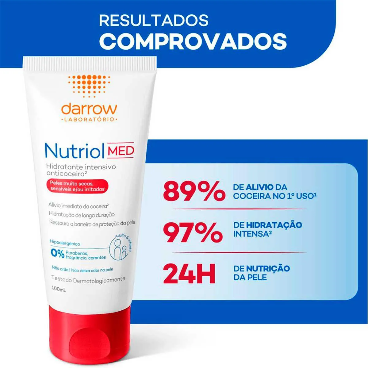 Sua fórmula exclusiva alia um complexo Nutri-hidratante (ácidos graxos + glicerina) que repara de forma duradoura e um Complexo Restaura-calm (Cera alba + ácido betaglicirretínico) que acalma a pele imediatamente e restaura sua barreira de proteção. Com eficácia comprovada cientificamente, garante -89% de coceira no 1º uso. Nutriol Med é hipoalergênico e pode ser usado por adultos e crianças. Não arde e não deixa odor na pele. 0% de álcool, parabenos, fragrância e corantes.