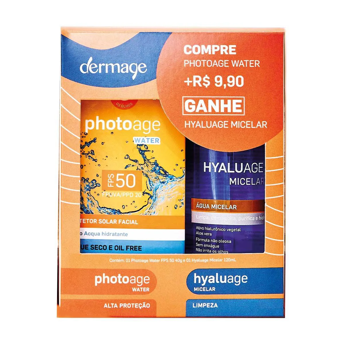 Kit Dermage Protetor Solar Facial Photoage Water FPS 50 40g + Água Micelar Hyaluage Micelar 120ml
