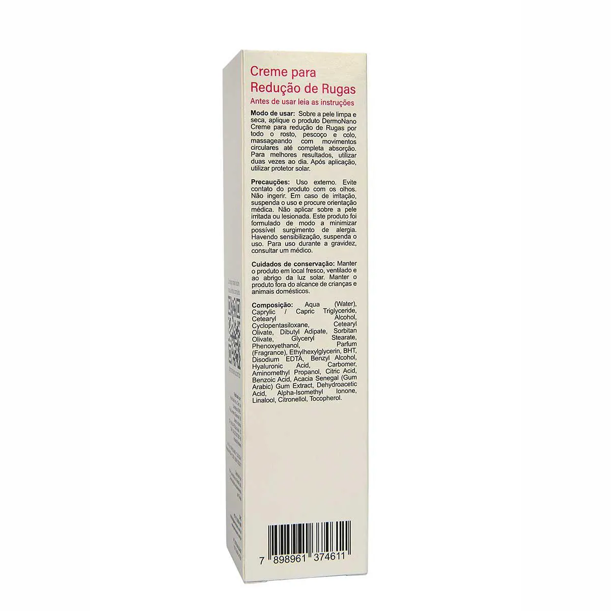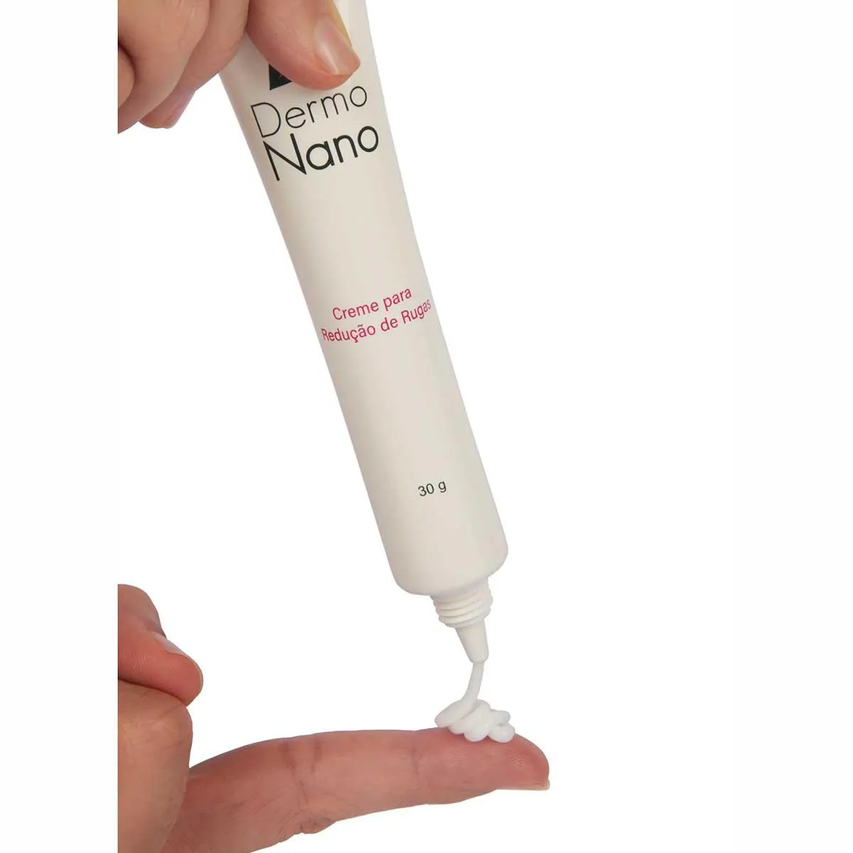 O Creme para Redução de Rugas DermoNano estimula a síntese de colágeno, conferindo firmeza e redução das linhas de expressão. Pode ser usado diariamente, duas vezes ao dia, no rosto, pescoço e colo.