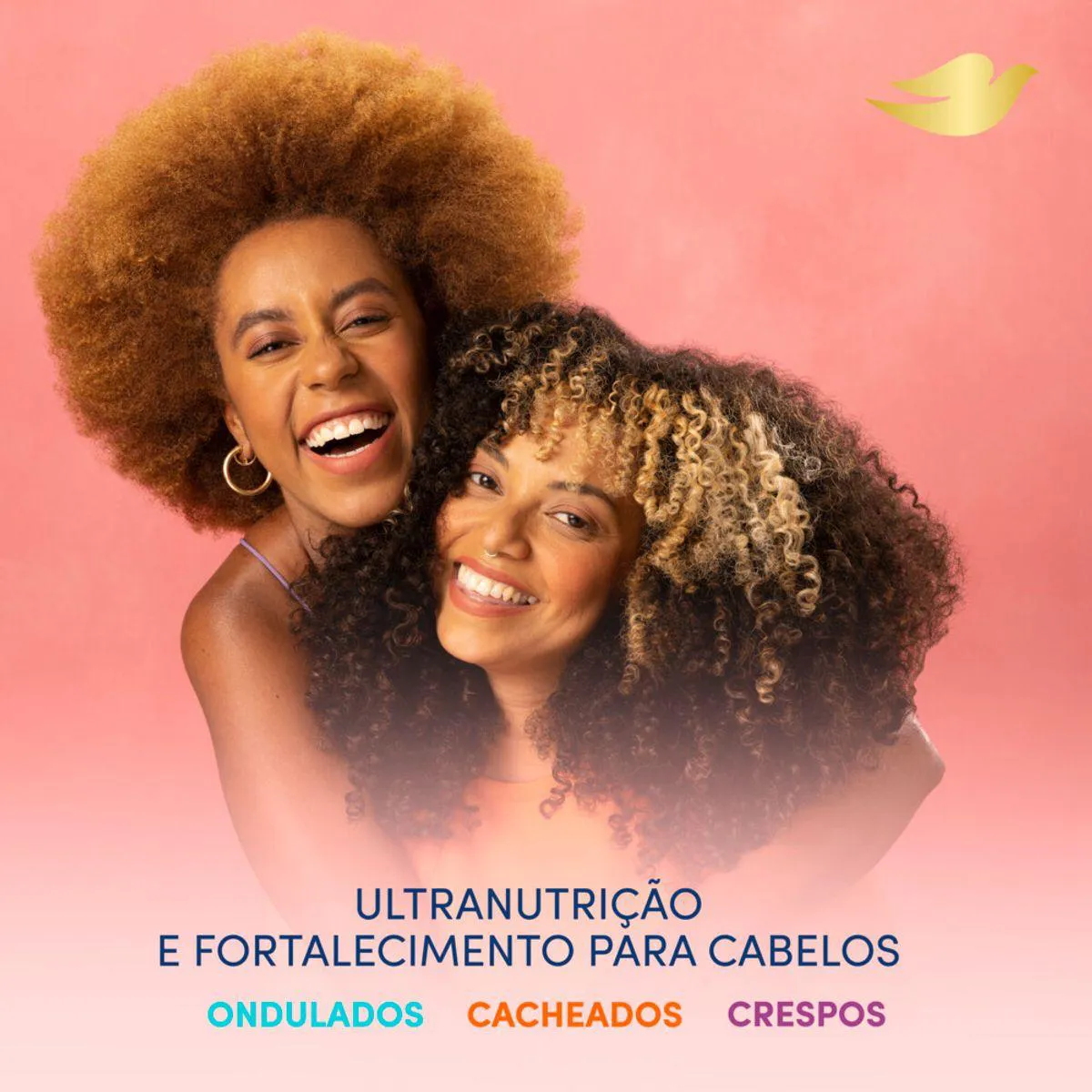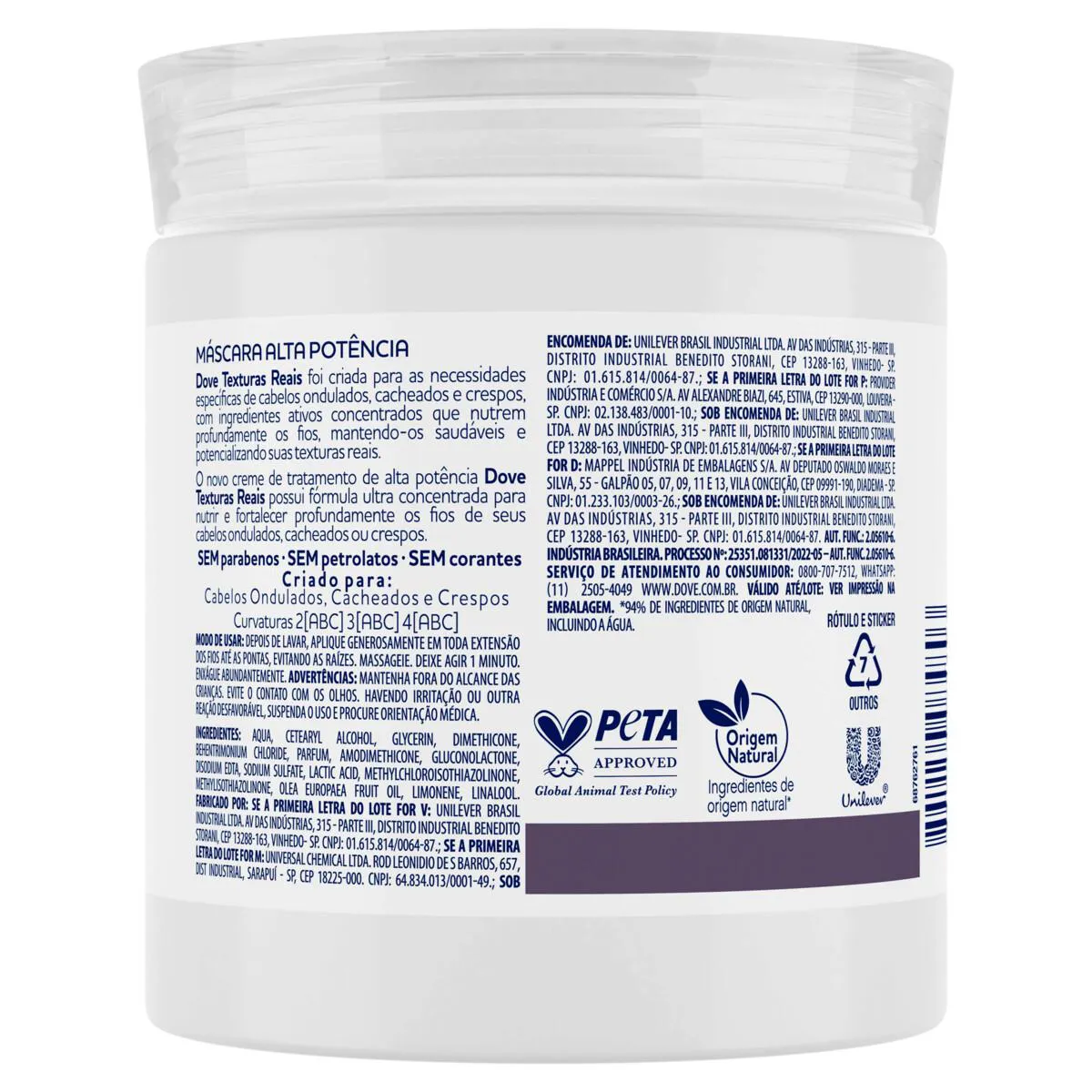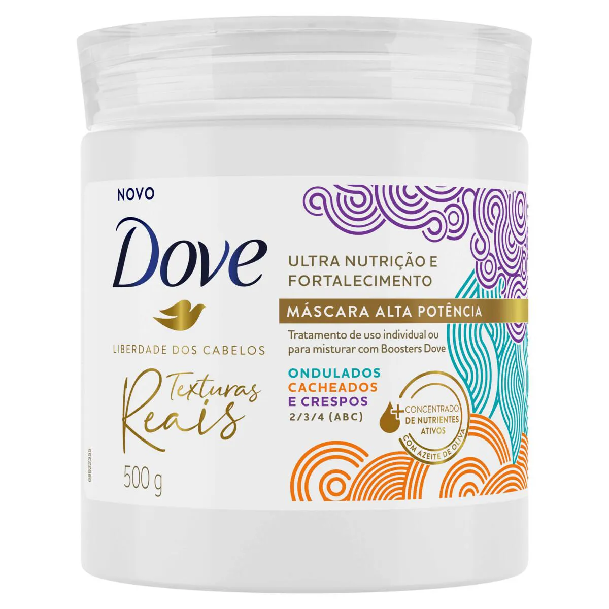 A Máscara de Tratamento Dove Texturas Reais é de alta potência e promove ultra desembaraço, nutrição e fortalecimento e deve ser usada para a hidratação dos cabelos ondulados, cacheados e crespos tipo 2/3/4 (A B C).