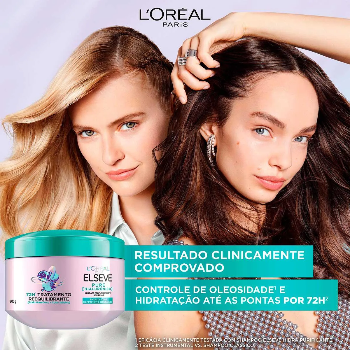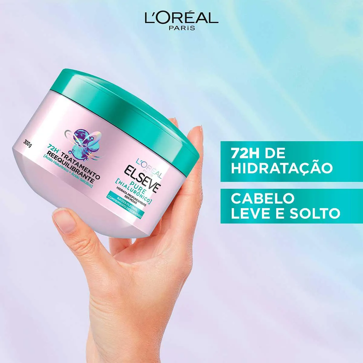 Desenvolvido com dupla ação do poder de Ácido hialurônico + Ácido salicílico, o Creme de Tratamento Reequilibrante Elseve Pure Hialurônico hidrata intensamente a fibra capilar até as pontas por 72 horas sem pesar.