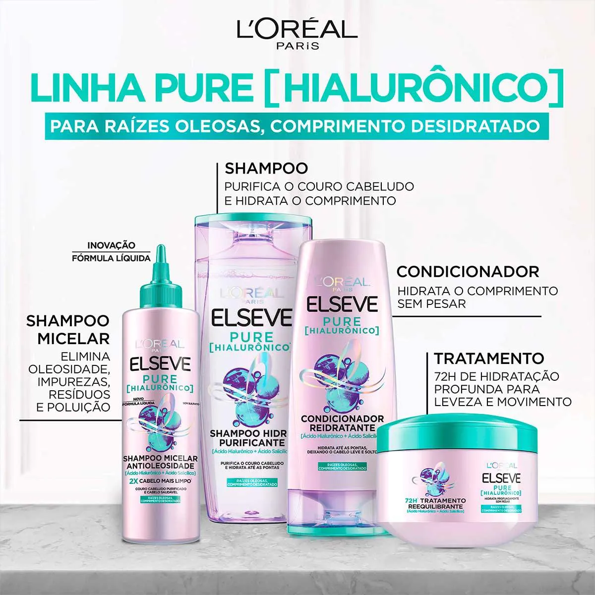 Elseve Pure Hialurônico é uma linha exclusiva da L’Oréal Paris composta por shampoo, condicionador e creme de Tratamento, que purifica as raízes e limpa profundamente a fibra capilar.
