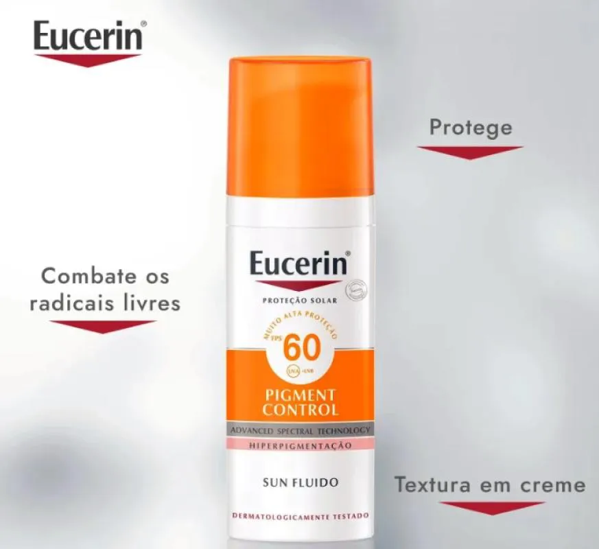 Protetor solar facial. Eucerin Sun Pigment Control Tinted FPS70 oferece proteção solar e combate os radicais livres causados pela exposição à luz visível.