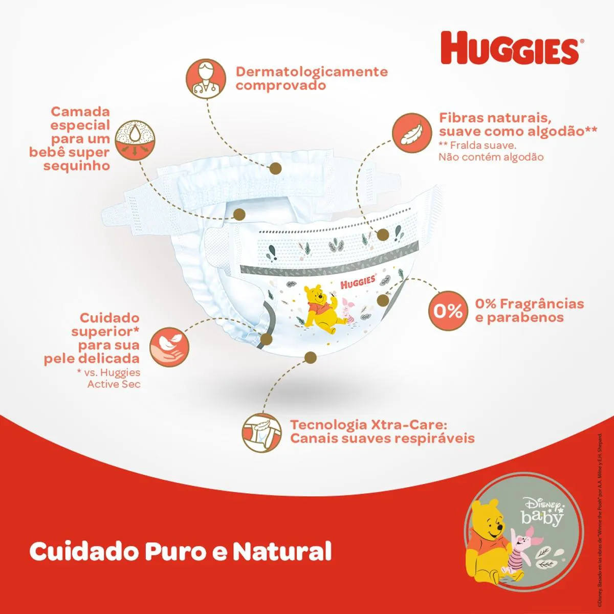 A Huggies Natural Care é uma fralda descartável suave como algodão que conta com materiais respiráveis para a Pele delicada do bebê, orelhas elásticas macias, bolinhas suaves para a absorção das fezes líquidas e indicador de umidade que mostra quando chegou a hora da troca.