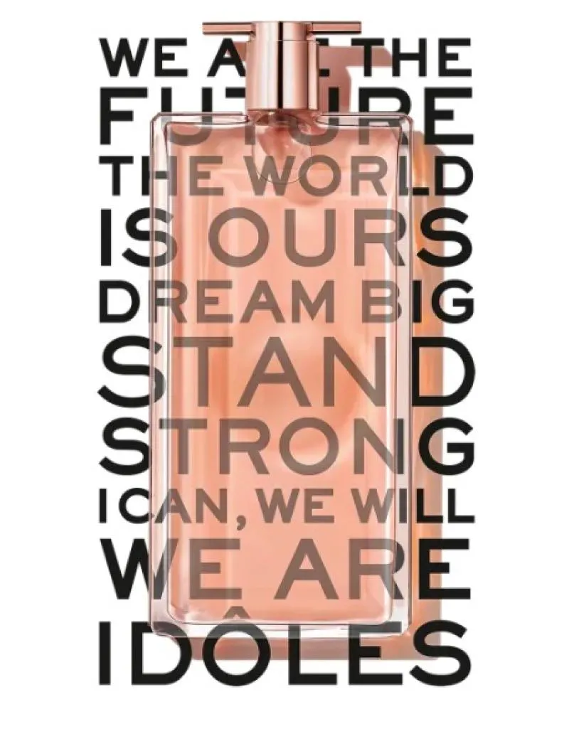 O frasco do perfume Lancôme Idôle homenageia as inovações tecnológicas com seu formato retangular e fino, semelhante a um celular: o acessório indispensável da mulher moderna. Idôle defende que mulheres reais são icônicas e se transformam em seu próprio ídolo através de atitudes corajosas e pioneiras.