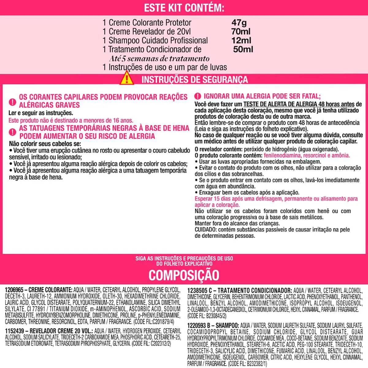 Coloque a tinta no frasco aplicador e agite bem até ficar homogêneo. Separe o cabelo e aplique da raiz as pontas e espalhe uniformemente em todo o cabelo (aplique a tinta com o cabelo seco). Retire o produto após 35 ou 40 minutos da aplicação. Indicações: Para cabelo curto usar somente 1 Caixinha, para cabelo longo utilizar 2 caixinhas.