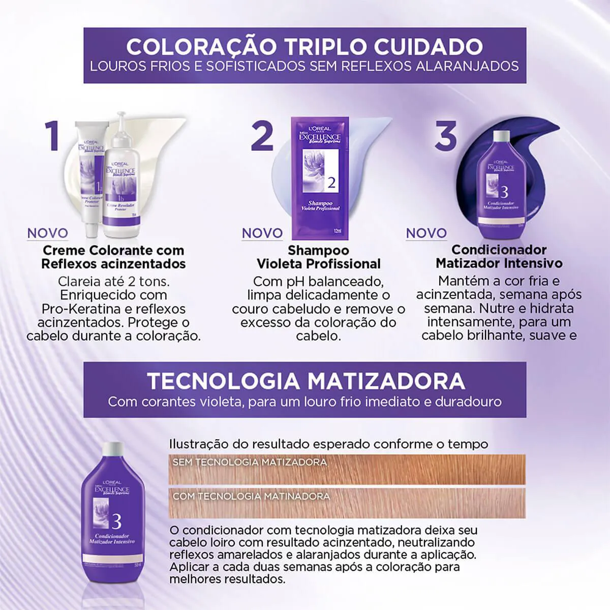 Creme Colorante: Clareia até 2 tons. Enriquecido Pró-Keratina e reflexos acinzentados. Protege o cabelo durante a coloração. Cor intensa e de longa duração. Shampoo Violeta Profissional: Com pH balanceado, limpa delicadamente o couro cabeludo e remove o excesso da coloração do cabelo. Condicionador Matizador Intensivo: Mantém a cor fria e acinzentada, semana após semana. Nutre e hidrata intensamente para um cabelo brilhante, suave e leve.