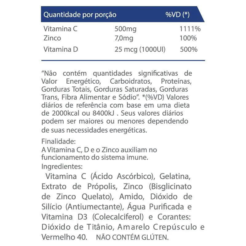 VItamina c (ácido ascórbico), gelatina, extrato de própolis, zinco (bisglicinato de zinco), amido, dióxido de silício (antiumectante), água purificada e vitamina d3 (colecalciferol) e corantes: dióxido de titânio, amarelo crepúsculo e vermelho 40. Não contém Glúten.