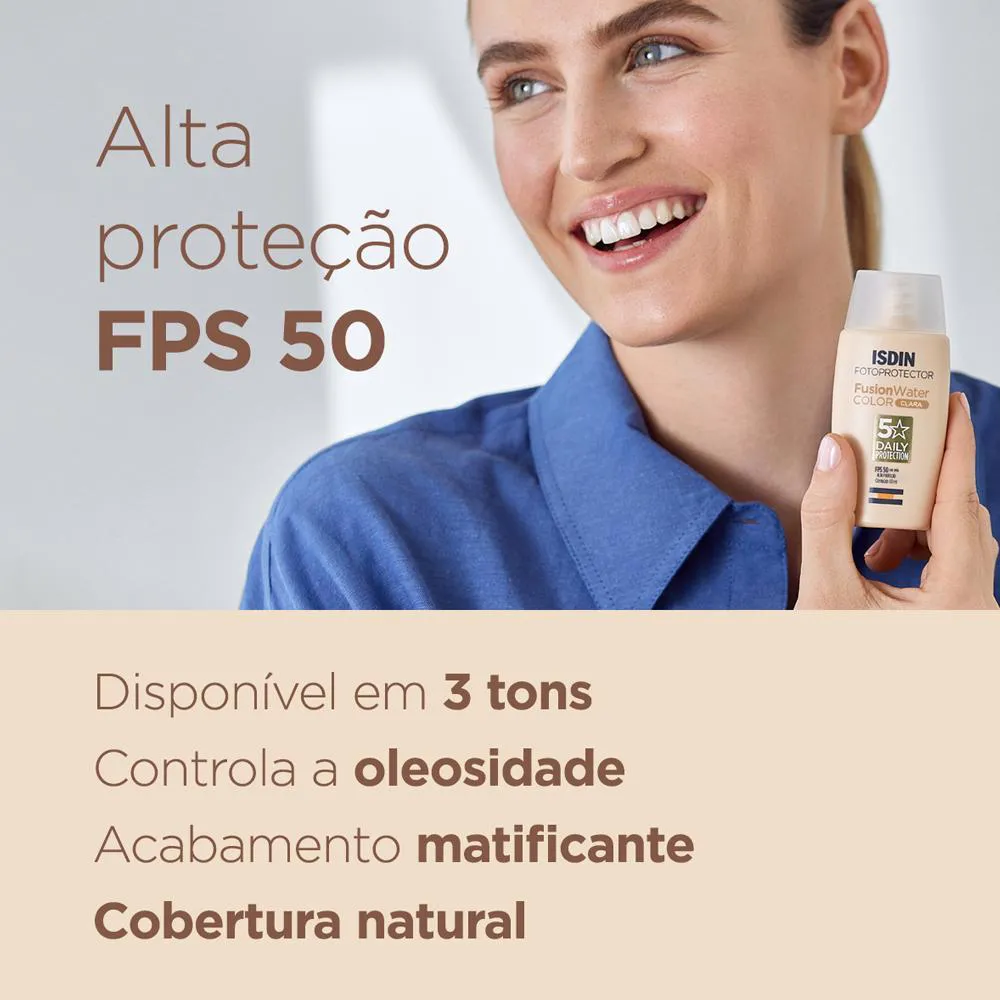 ISDIN FUSION WATER 5 STARS COLOR PROTETOR SOLAR FACIAL COM COR FPS50 CLARA 50ML