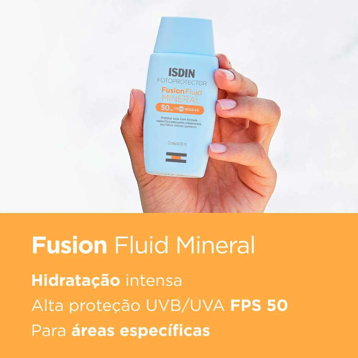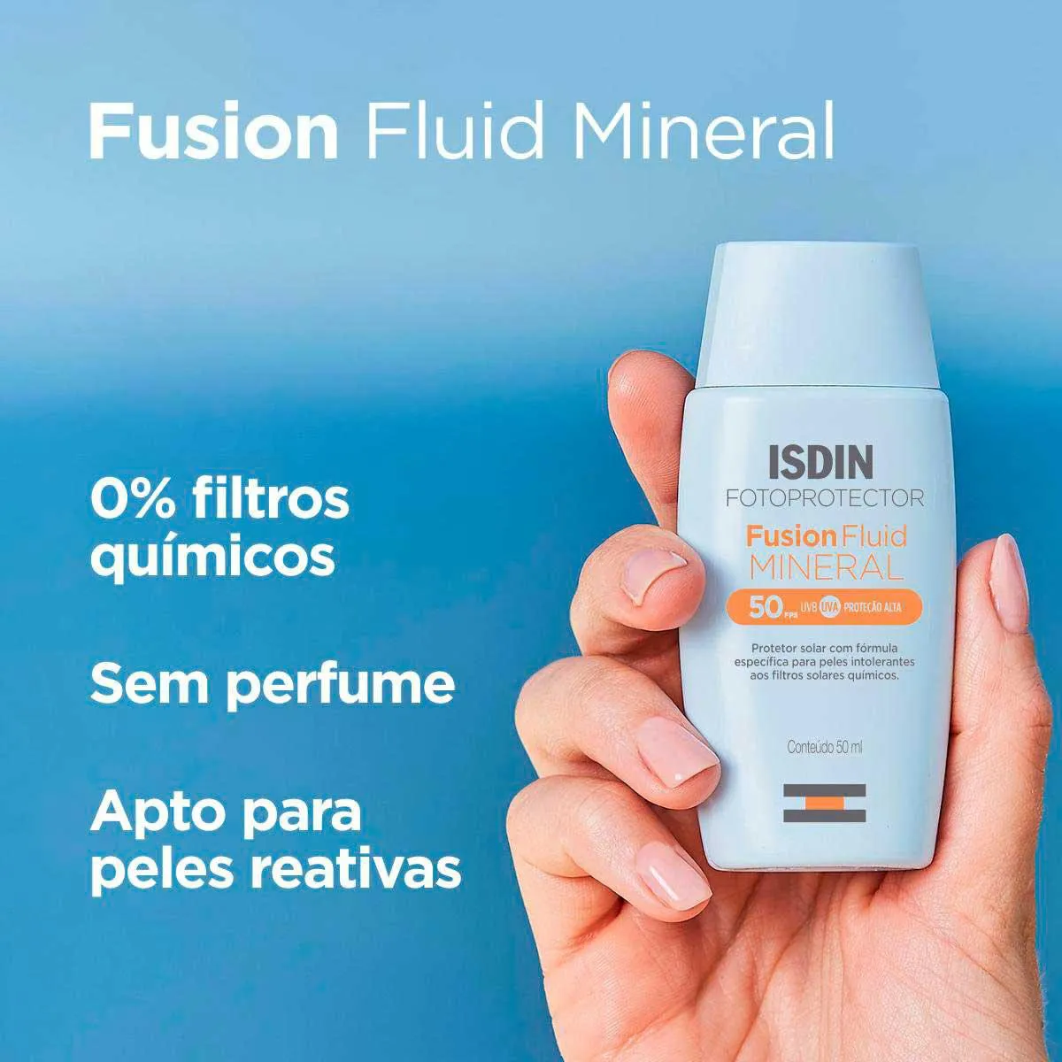 Isdin Fusion Fluid Mineral é um protetor solar com 100% filtros físicos, indicado para peles reativas ou intolerantes aos filtros químicos. Com textura fluida de rápida absorção, ele é um produto Oil-free e sem perfume.