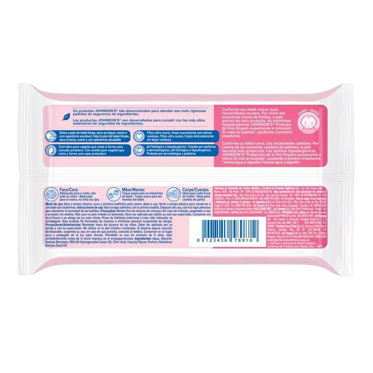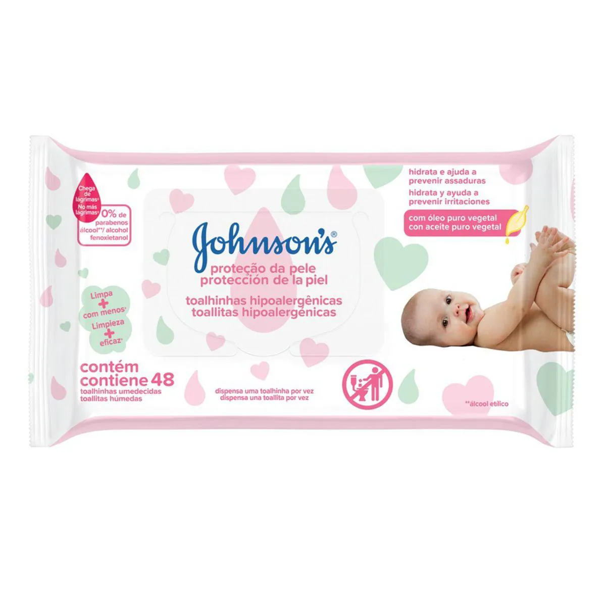 Os Lenços Umedecidos Johnson's Baby Proteção da Pele são toalhinhas hipoalergênicas que podem ser utilizadas para a limpeza de todo o corpo do bebê, até mesmo o rosto. Sem arder os Olhos, a partir da tecnologia Chega de Lágrimas, as toalhas são enriquecidas com Loção hidratante e óleo vegetal puro, que previne irritações e assaduras, deixando a pele do bebê hidratada e preservando as barreiras cutâneas naturais.
