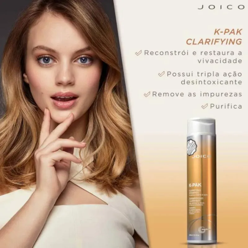 Shampoo Joico K-PAK Clarifying Smart Release apresenta tripla ação desintoxicante. Remove resíduos minerais, impurezas e o acúmulo de produtos, enquanto hidrata o cabelo.