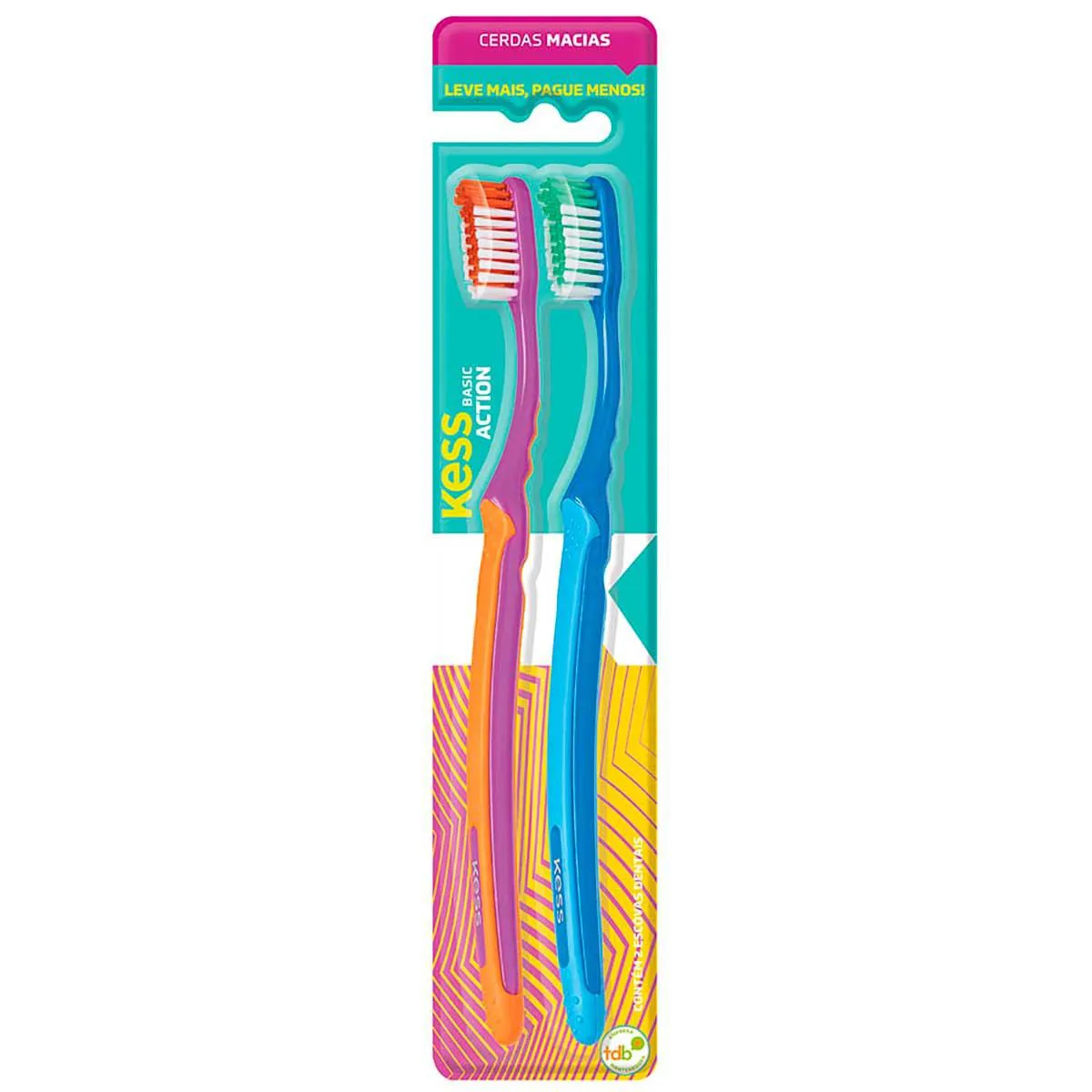 Pack com 2 Escovas Basic Action Macia Kess com cerdas macias de nylon polidas e arredondadas.