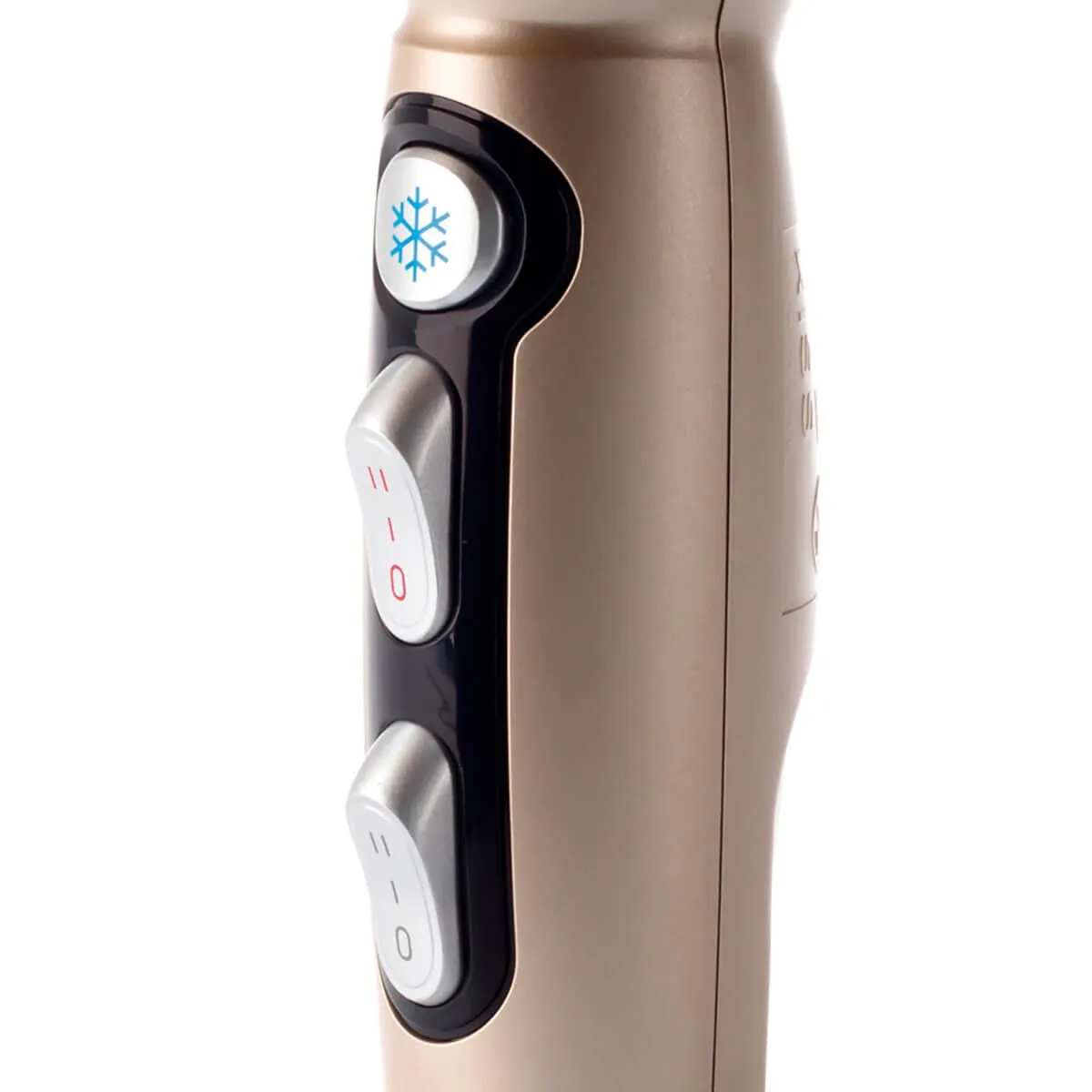 Com motor AC, mais duradouro e poderoso, três opções de temperatura e duas de velocidade, seu uso proporciona um cabelo macio, brilhante e com menos frizz. Ainda, conta com um botão de jato de ar frio e um cabo resistente de 3 metros.