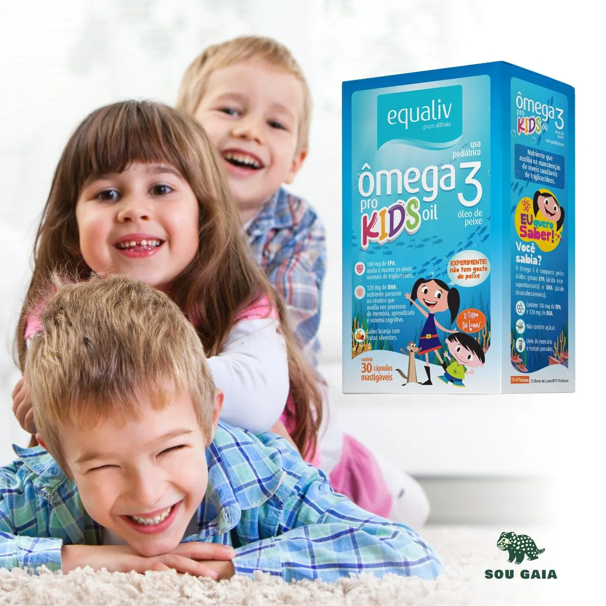 **** Kit 2 Ômega 3 Pro Kids Oil ***** Equaliv Ômega 3 Pro Kids Oil é um suplemento à Base de óleo de peixe, em cápsulas mastigáveis sabor laranja, recomendado para o público Infantil.  Apresentado em cápsulas mastigáveis e com sabor laranja, a adesão pelo público infantil é grande.