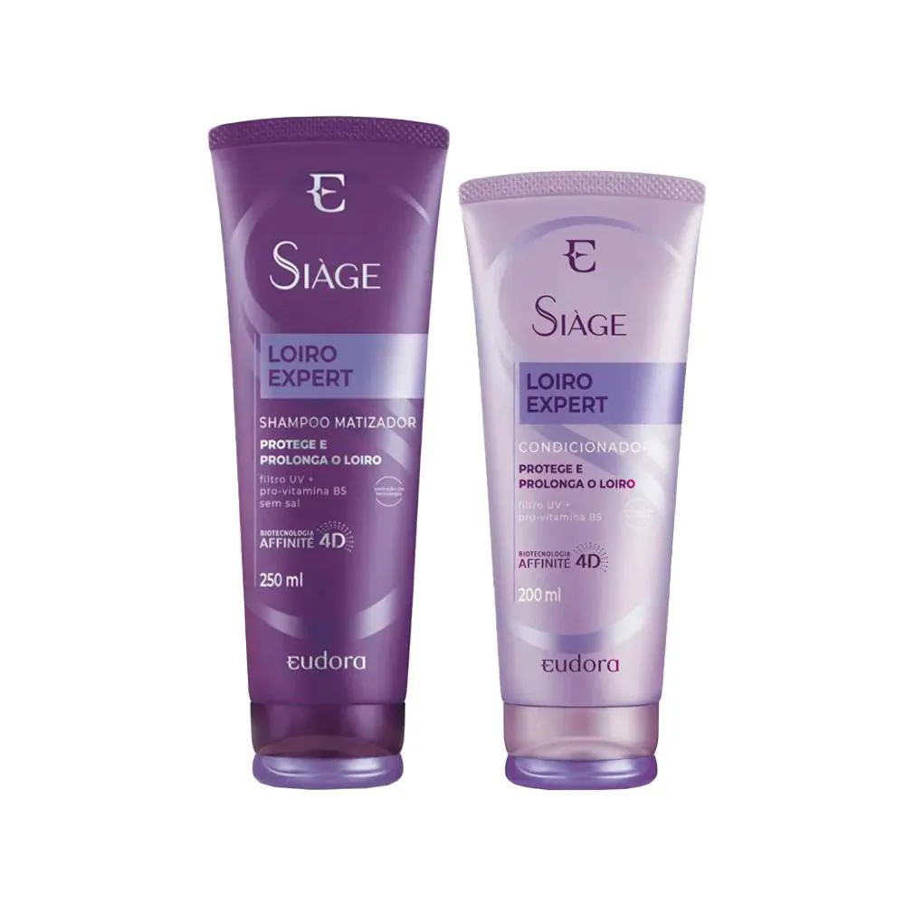 O Kit Siàge Loiro Expert foi desenvolvido especialmente para tratar cabelos descoloridos,enriquecida com Filtro UV e Pro-Vitamina B5 que protege os cabelos da exposição diária ao sol e garante um loiro radiante e bem cuidado por mais tempo.Cuidar dos cabelos, porque são importantes para você! * RESULTADO: HidrataçãoMatização da Cor * SUGESTÕES DE USO: Shampoo1.Aplique sobre os cabelos úmidos, massageando suavemente o couro cabeludo até formar espuma.2.Enxágue abundantemente e reaplique se necessário. Condicionador1.Após lavar os cabelos com o Shampoo da linha, aplique o condicionador em todo o comprimento e nas pontas.2.Deixe agir por 1 minuto e enxágue. * OBSERVAÇÕES: Imagem Meramente Ilustrativa * ITENS INCLUSOS: 1 Eud Siáge Loiro Expert Matizador Shampoo 250ml;1 Eud Siáge Loiro Expert Matizador Condicionador 200ml.