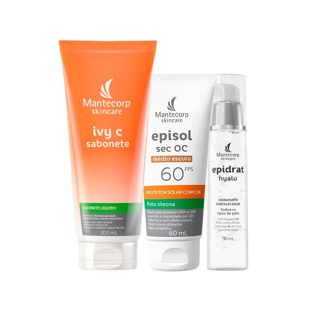 Kit Facial MantecorpQuando tratamos de Beleza e Saúde da Pele brasileira a diversidade ultrapassa padrões e fronteiras, em tipos, tons e necessidades.E a Mantecorp Skincare descobriu tudo isso com você, que aprendeu com o tempo como sua pele é de verdade e sabe o que ela precisa todo dia pra você se sentir bem e confiante.Protetor Solar facil com cor para pele oleosa. São 3 tons de cor desenvolvidos para pele brasileira: Claro, Médio e Médio Escuro. Possui cobertura efeito natural, controle da oleosidade por 12h, redução e Tratamento de poros com rápida absorção. O uso de Episol Color sec Oc garante efeito matte, toque seco, sensação de pele limpa e preservação do colágeno. Ivy C Sabonete líquido é um produto a Base de vitamina c indicado para limpeza facial diária. Remove as células mortas da superfície da pele e mantém a hidratação natural por 2 horas. Contém Vitamina C nanoencapsula, Ácido Glicólico, Ácido Hialurônico e Aloe vera. Com ação antipoluição limpando a pele sem resseca-la. Hidratante fortalecedor com ação antipoluição e que melhora a luminosidade, firmeza e elasticidade da pele. Epidrat Hyalu traz uma textura leve em sérum de rápida absorção que fortalece a pele e hidrata por 24 horas, melhora a luminosidade, firmeza e elasticidade, prevenindo o envelhecimento da pele. Testado também em peles sensíveis, melhora os sinais e sintomas associados ao ressecamento cutâneo, além de manter o pH fisiológico da pele. Cuidados da pele com Mantecorp! * RESULTADO: Proteção Solar; Limpeza; Hidratação * SUGESTÕES DE USO: Protetor Solar 1.O produto deve ser aplicado em abundância e uniformemente sobre a pele antes da exposição ao sol.2.Reaplicar quando necessário.3.Uso diário. Sabonete1.Aplicar na pele, massagear e enxaguar.  Gel 1.Aplicar diariamente no rosto com a pele limpa e seca, pela manhã e à noite, ou conforme orientação médica. * OBSERVAÇÕES: Imagem Meramente Ilustrativa * ITENS INCLUSOS:                       1 Mantecorp Episol Sec Oc Protetor Solar FPS 60 Médio Escuro 60 ml;                      1 Mantecorp Ivy C Sabonete Líquido Facial de Limpeza 200ml;                      1 Mantecorp Epidrat Hyalu Gel Hidratante Fortalecedor 50ml.