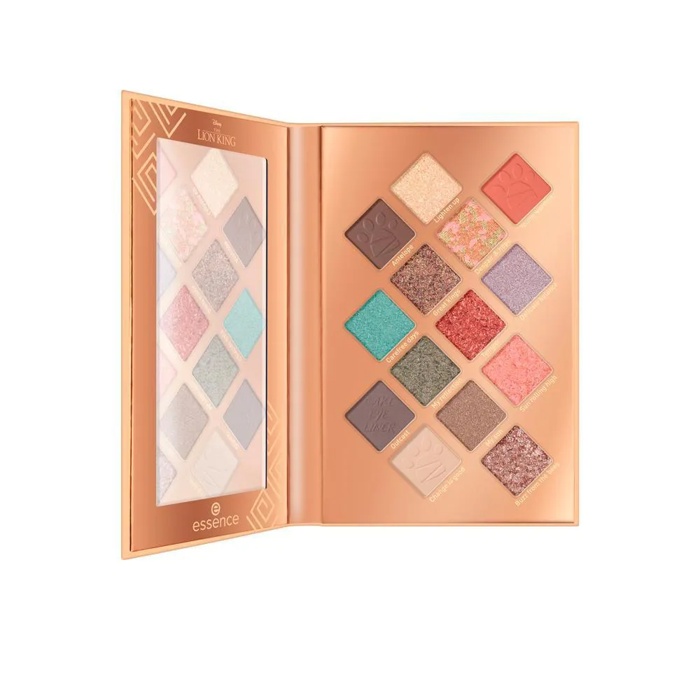 Paleta de Sombras em Pó Essence Disney The Lion King garante um look incrível. Possui 14 tons entre brilhantes, mattes e metálicos, além de um tom (cake eye liner) que é possível usar como delineado. Suas texturas são altamente pigmentadas e garantem um efeito Wow. Crie looks únicos e versátieis. A paleta vem com um design super fofo temático do Rei Leão e um espelho de tamanho grande.