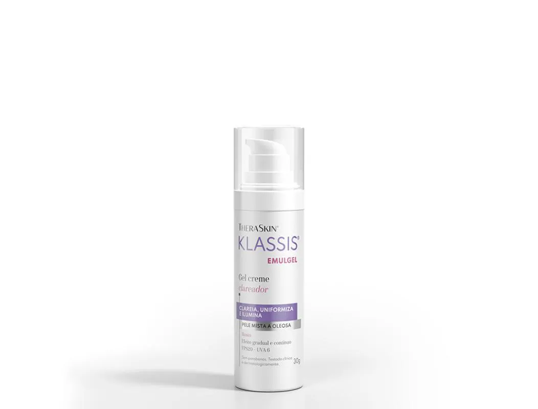 Sua fórmula emulgel é ideal para peles mistas e oleosas¹. O Clareador Klassis® Emulgel é um clareador com protetor solar para pele mista e oleosa, que traz em sua fórmula fotoproteção contra os raios UVA e UVB (FPS20/UVA6)²,³, atuando também na prevenção dos sinais do fotoenvelhecimento¹, que contribui para deixar a pele com uma textura mais áspera e espessa, com manchas e rugas mais acentuadas.