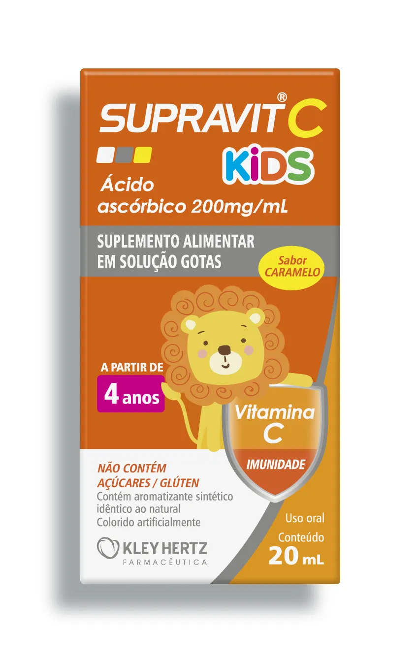 O Supravit C Kids é um suplemento alimentar em gotas com sabor de caramelo, que conta com 200mg de vitamina c.