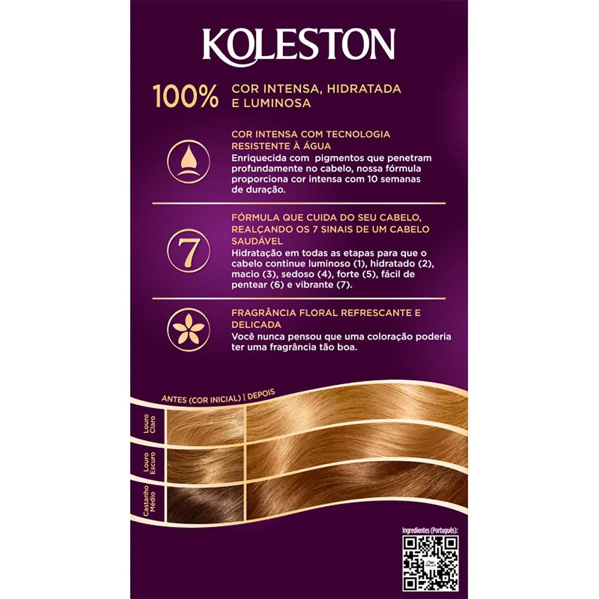 Oferece 100% da cobertura dos fios brancos, graças a tecnologia resistente à água. Seu exclusivo Tratamento Gloss Intenso deixa o cabelo com mais brilho, maciez e ajuda a manter a intensidade da cor. Além disso, o Kit Koleston vem com o Reativador de Cor que deposita mais pigmentos no seu cabelo para manter a cor mesmo depois de 15 dias. A tintura é de fácil aplicação e você pode tingir seus fios sozinha em Casa.