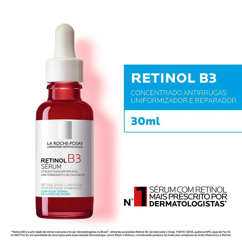 La Roche-Posay Retinol B3 é um sérum facial concentrado com alta eficácia antirrugas e máxima tolerância mesmo nas peles mais sensíveis. Ele possui uma textura sérum não oleosa de rápida absorção e possui em sua fórmula uma combinação de complexo retinol + ácido hialurônico + vitamina B3 + água termal de La Roche-Posay. * RESULTADO:Antirruga * SUGESTÕES DE USO:1. A aplicação deve ser feita à noite, usando de 2 a 3 gotas no rosto e pescoço.