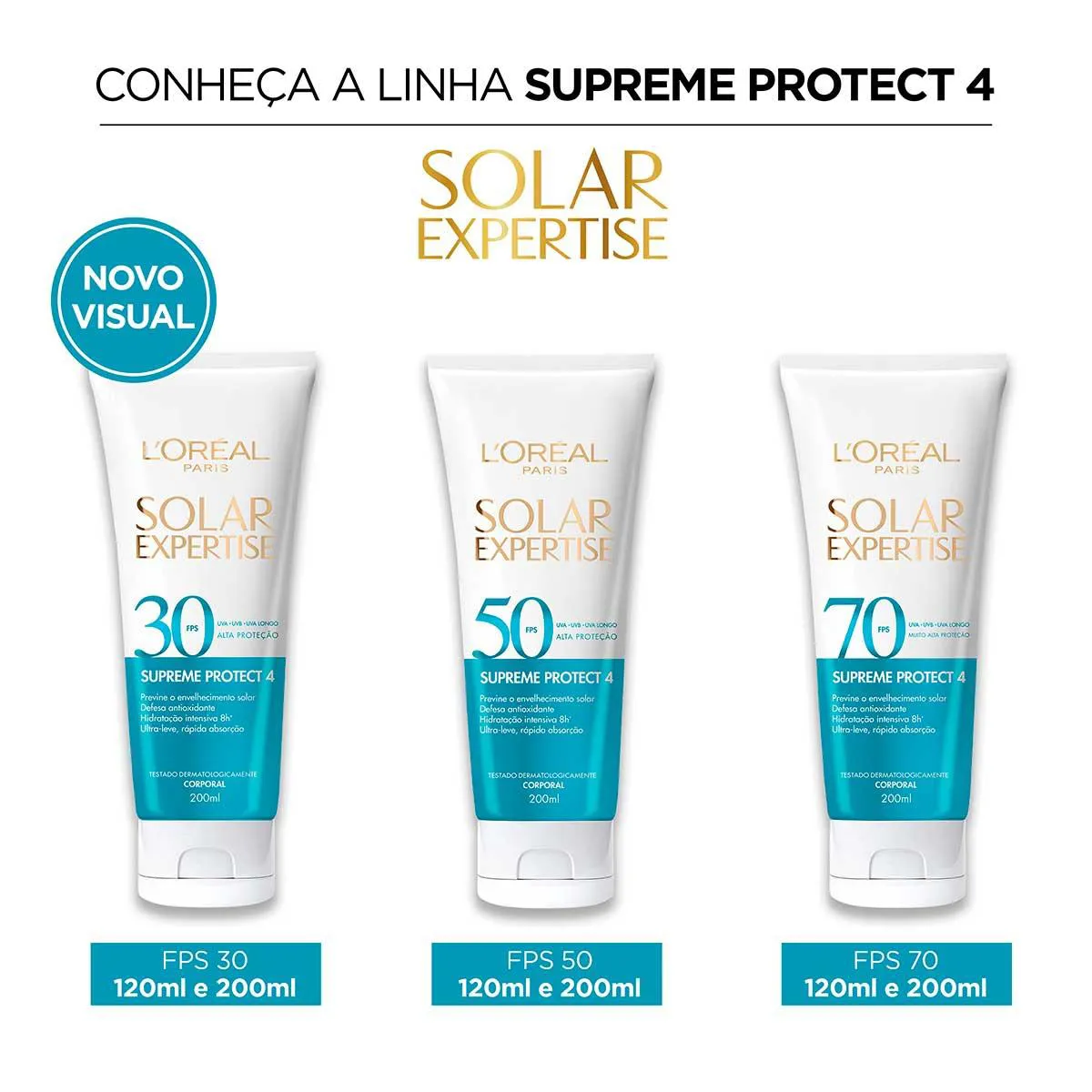 O L'Oréal Paris Solar Expertise Supreme Protect 4 é um protetor solar corporal que protege a Pele contra os danos causados pelo sol, além de hidratar intensamente e prevenir o envelhecimento e o aparecimento de manchas solares.