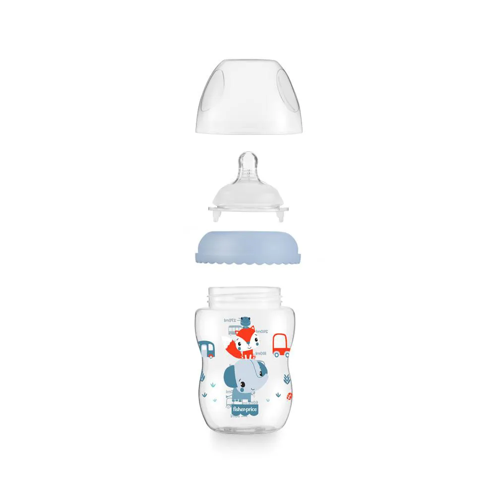 As mamadeiras First Moments Fisher-Price possuem bico em silicone macio e flexível, com base mais larga, assim como o seu bocal. Além disso, as mamadeiras são feitas com rosca de fácil encaixe. Uma de suas características principais é o sistema de ventilação dupla, que conta com duas válvulas de ar no bico. São totalmente livres de BPA.