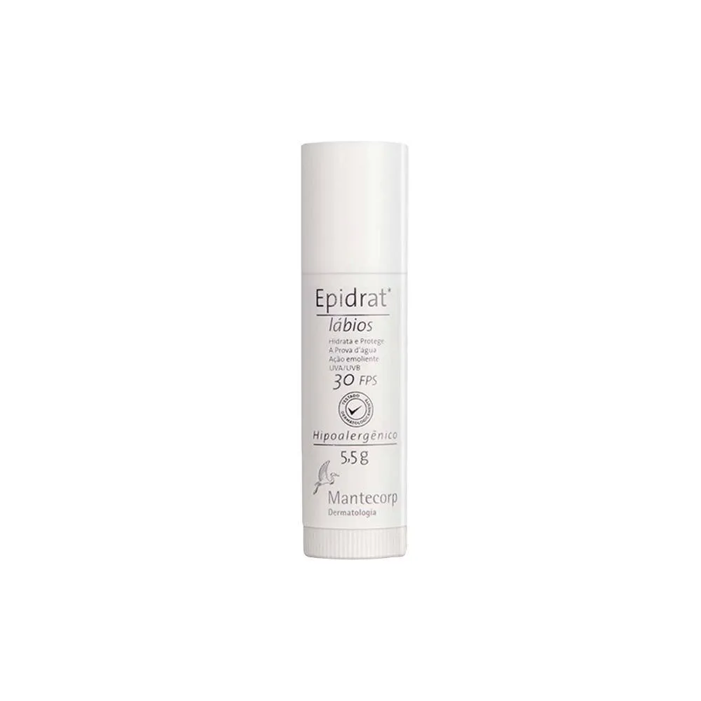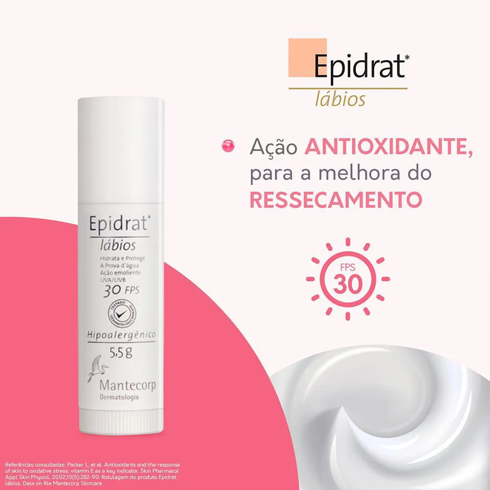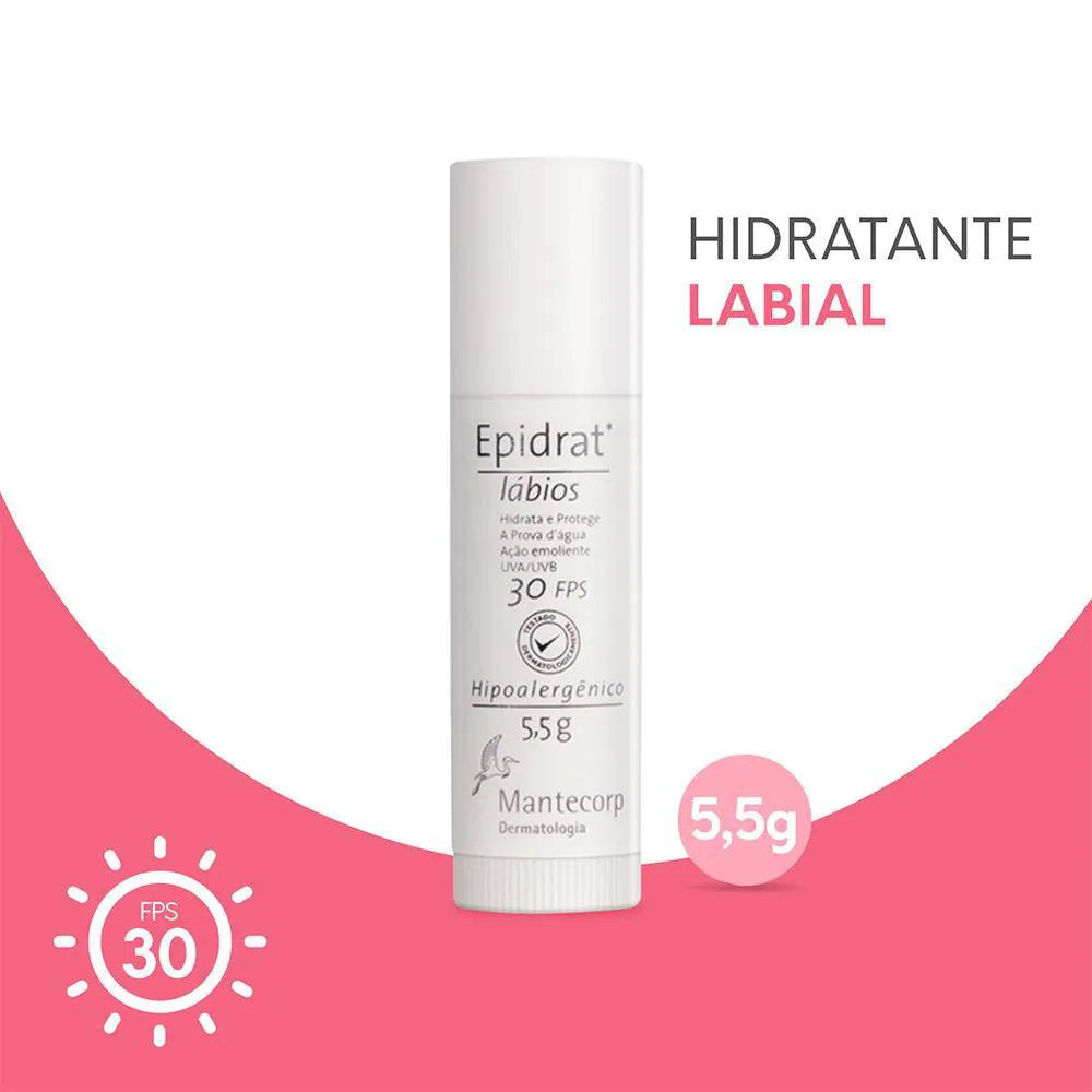 Hidratante Labial Epidrat previne queimaduras solares labiais conta com ação antioxidante para melhorar o ressecamento e a prevenção do envelhecimento dos Lábios. Proporciona hidratação intensa e protege dos raios UVA e UVB sendo altamente resistente a água. * RESULTADO: Hidratante Protetor Solar * SUGESTÕES DE USO: 1.Aplique o protetor labial diretamente nos seus lábios; 2.Para manter a Saúde dos lábios e deixá-los sempre macios, utilize o reparador labial diariamente. * OBSERVAÇÕES: Imagem Meramente Ilustrativa * ITENS INCLUSOS: 1 Mantecorp Epidrat Hidratante Labial FPS30 5,5g